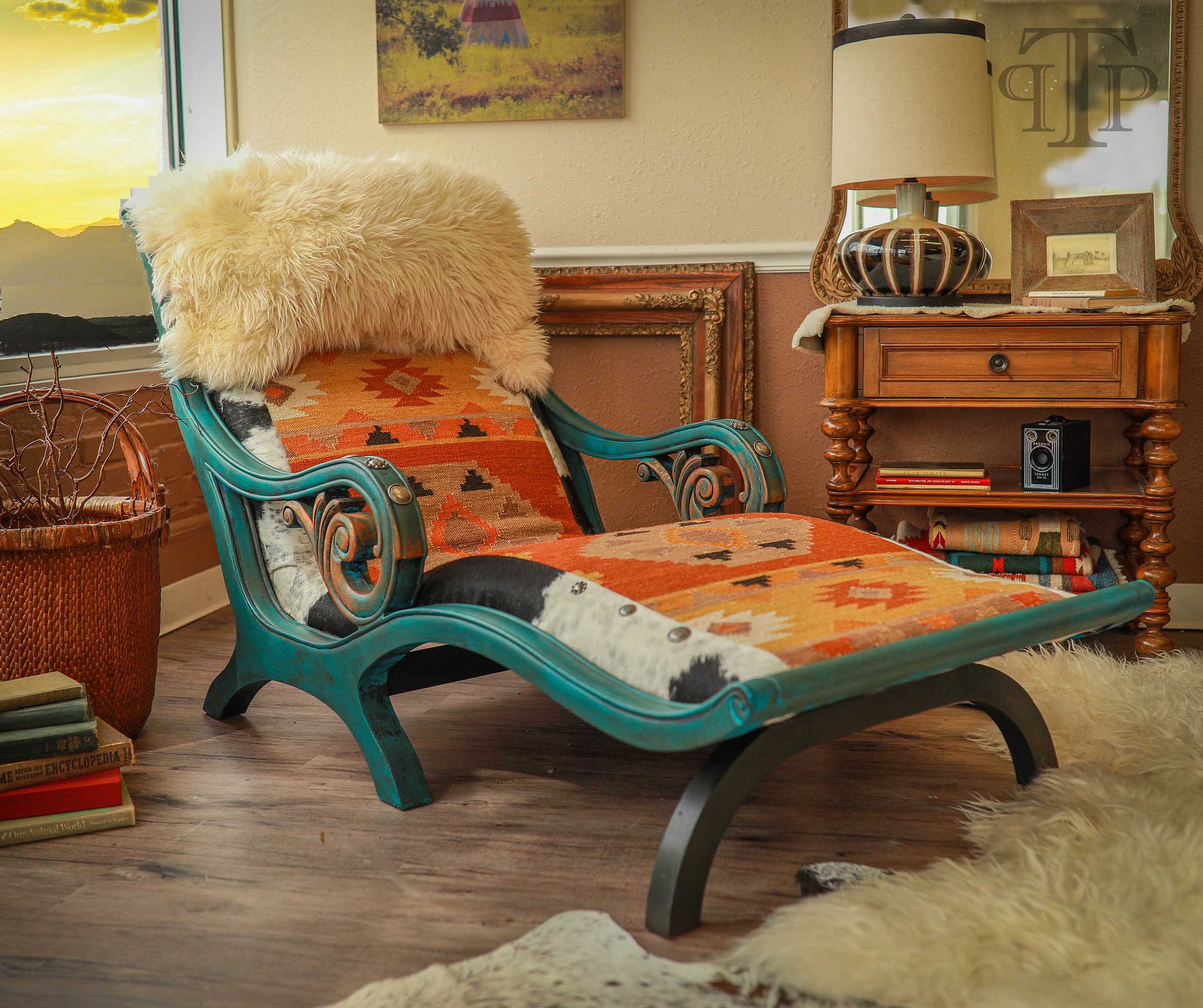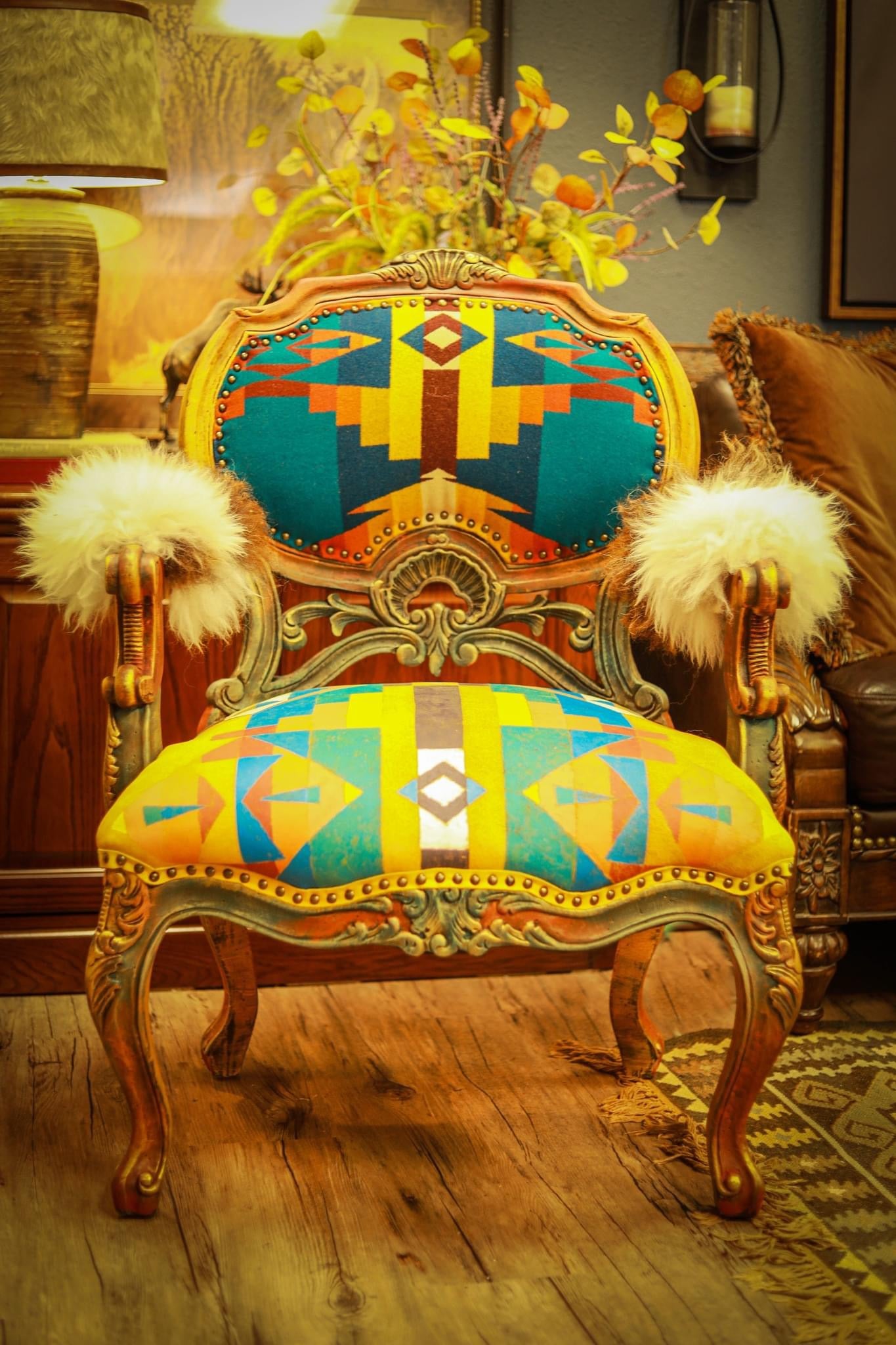 This beautiful Victorian parlor chair making all the Western heads turn. She's dressed with rare vintage Pendleton and a genuine leather back that displays a beautiful desert flower design.