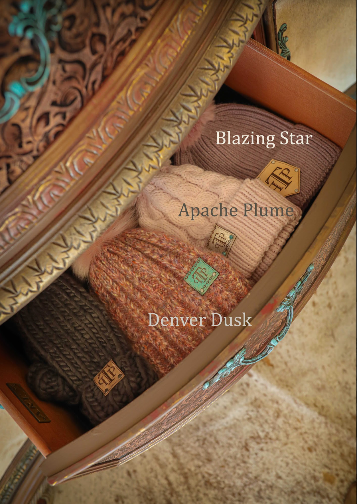 Hand picked pom pom beanies embellished with TPP genuine leather logo and turquise rivet detail.