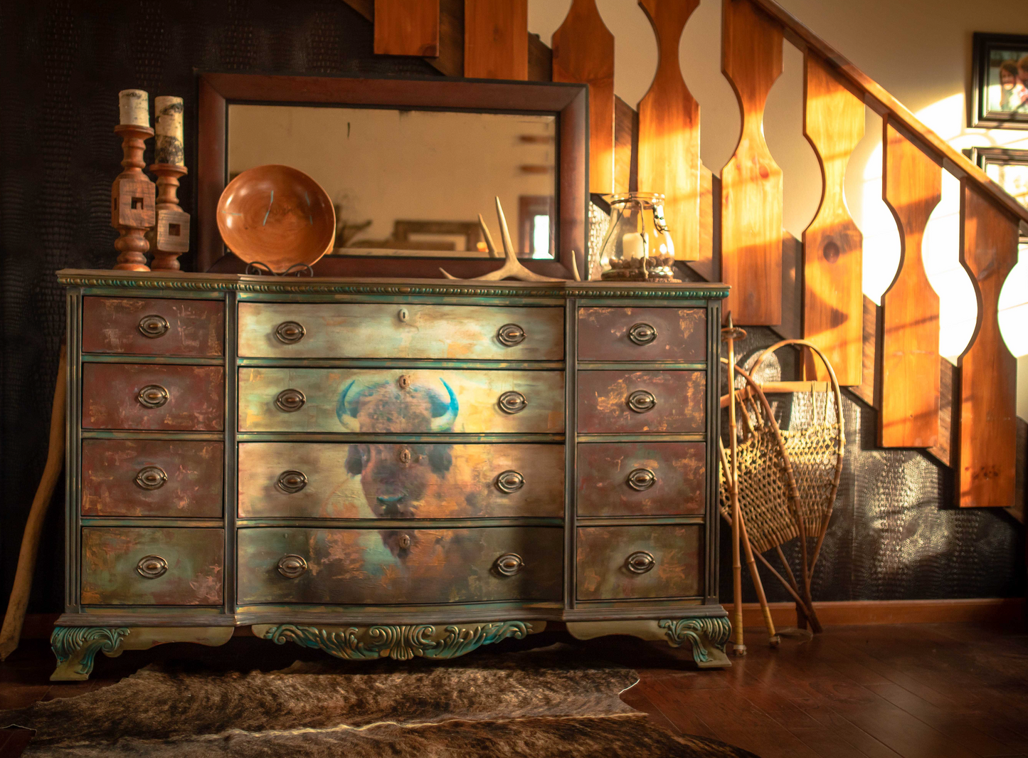 Quite a grandiose on-of-a-kind dresser from The Painted Pinto. This amazing dresser is hand painted and the majestic bison adorns this magnificent piece along with abundant colorful detail and is very deserving of a home for many years to come, quite frankly a heirloom piece for the generations.