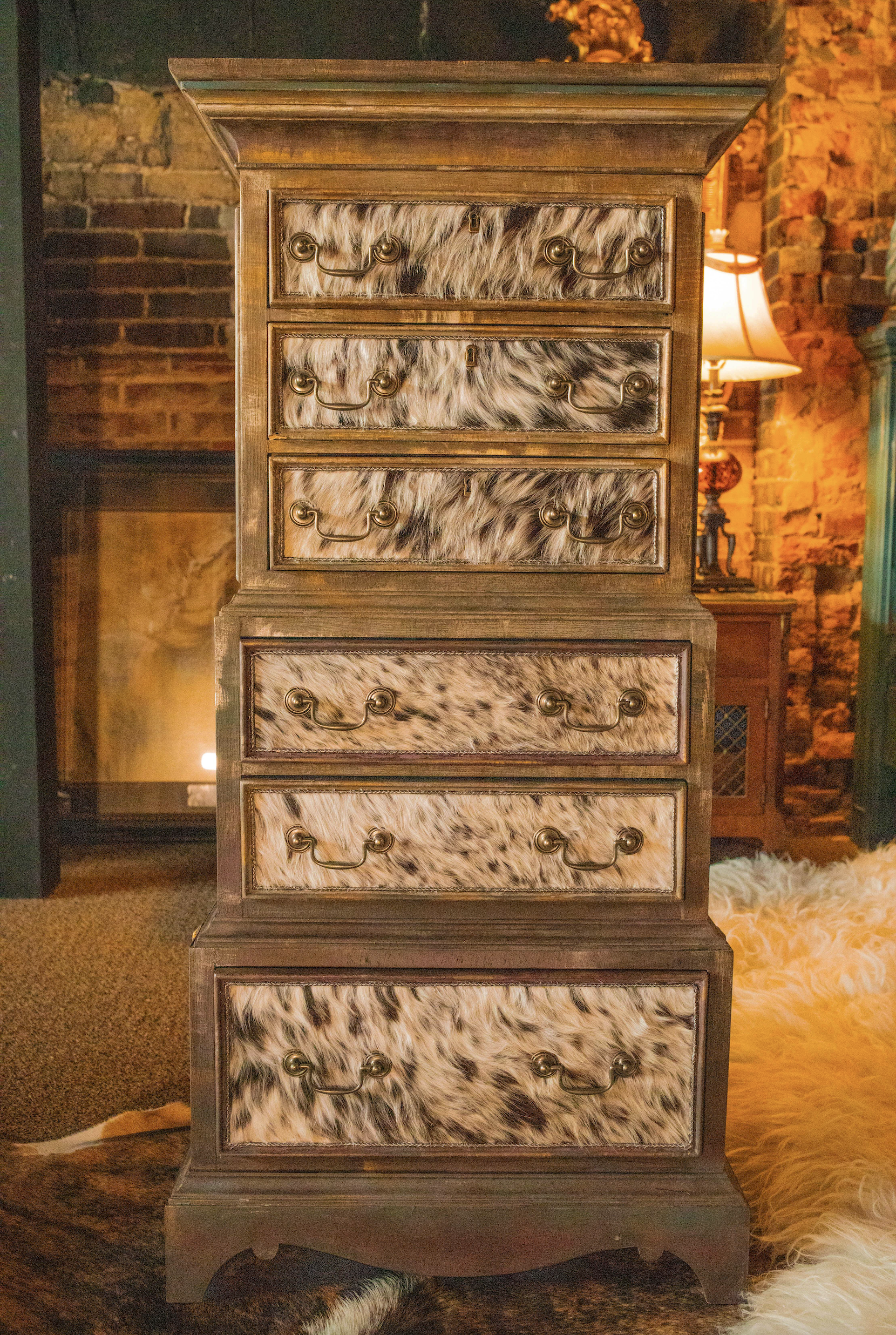 Comstock Lode is rustic chic at it's finest!! Handpainted one of a kind jewelry lingerie armoire. It is hand painted with the drawers fitted with beautiful long hair cowhide and trimed out with silver leather braided trim for that perfect detail. The drawers are velvet lined and are a rich cherry or plum color. It hosts a top storage with mirror, six substantial drawers and two side comparents for hanging jewelry.