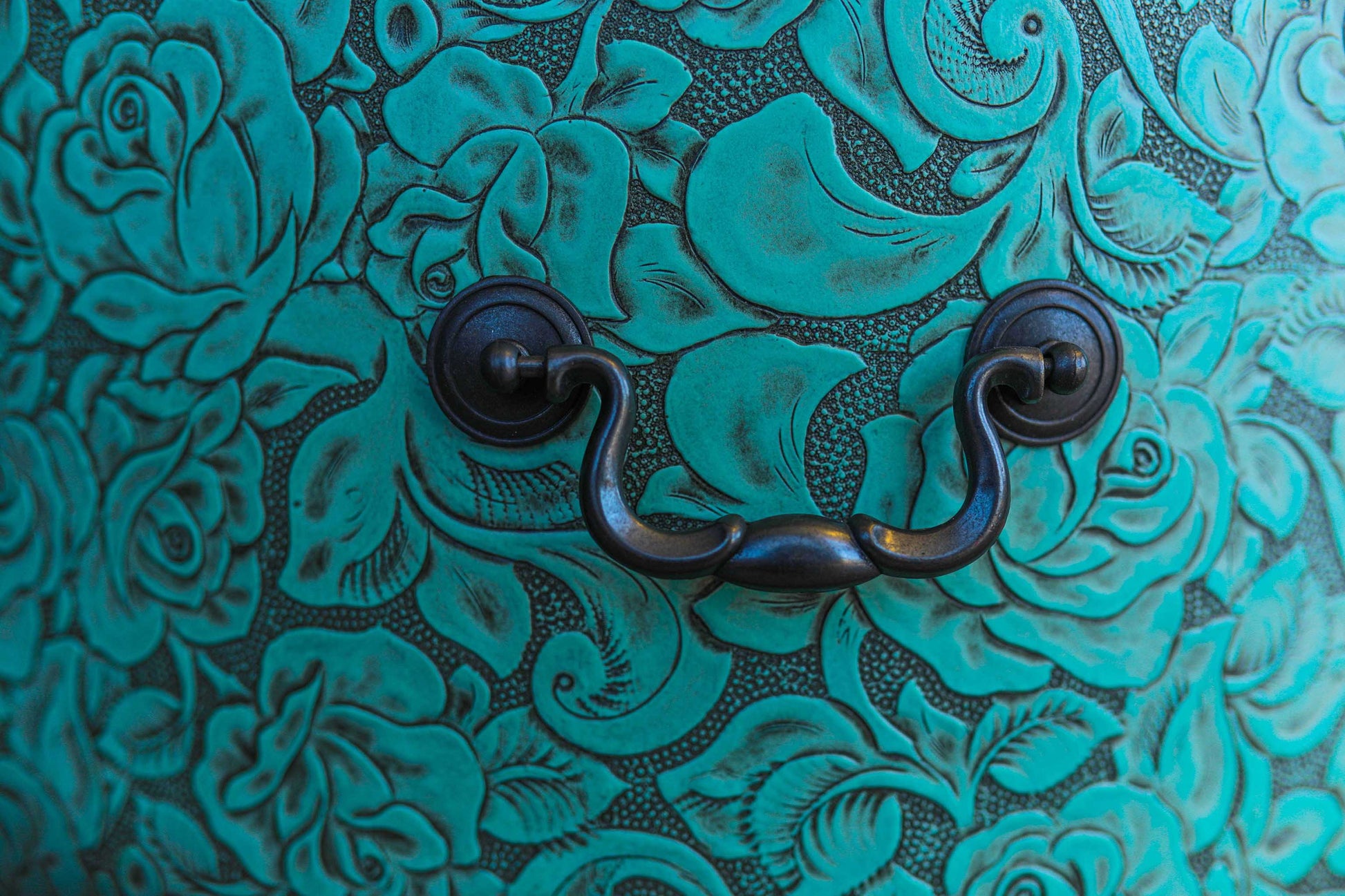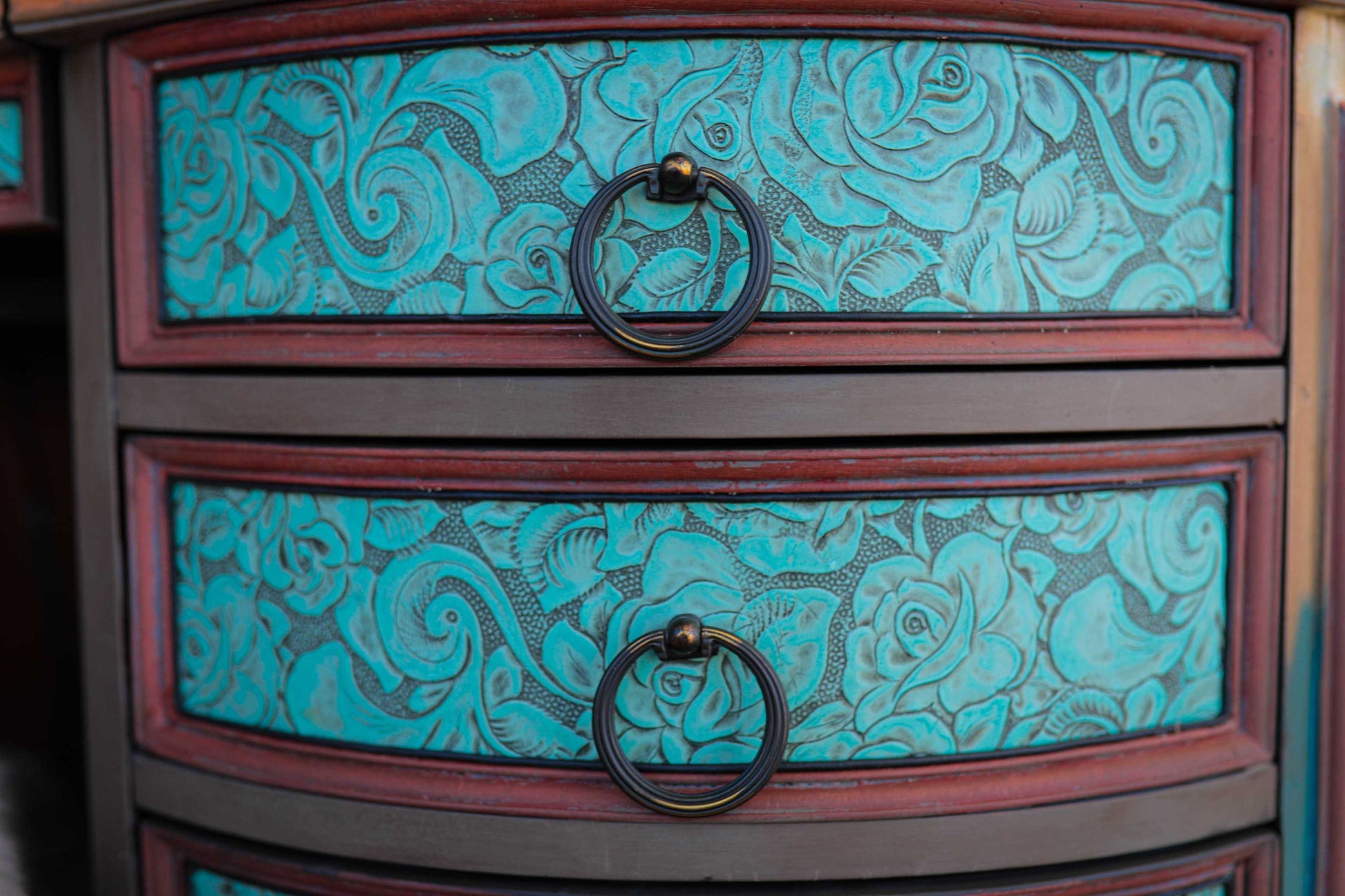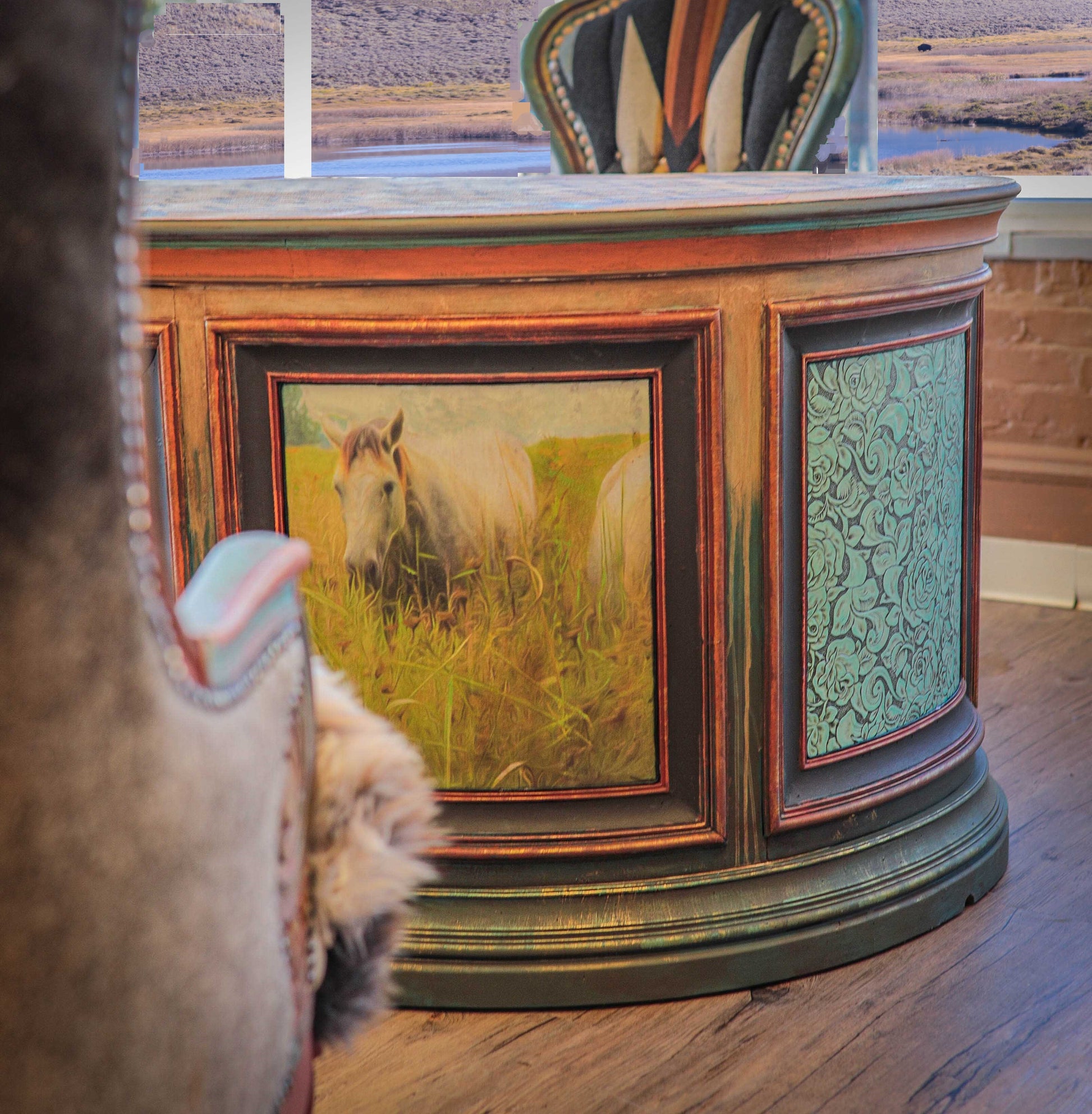 This hand painted desk features my very own Morning Graze limited edition decoupage paper along with beautiful turquoise embossed leather and hitching post style drawer pulls. Chair is sold separately.