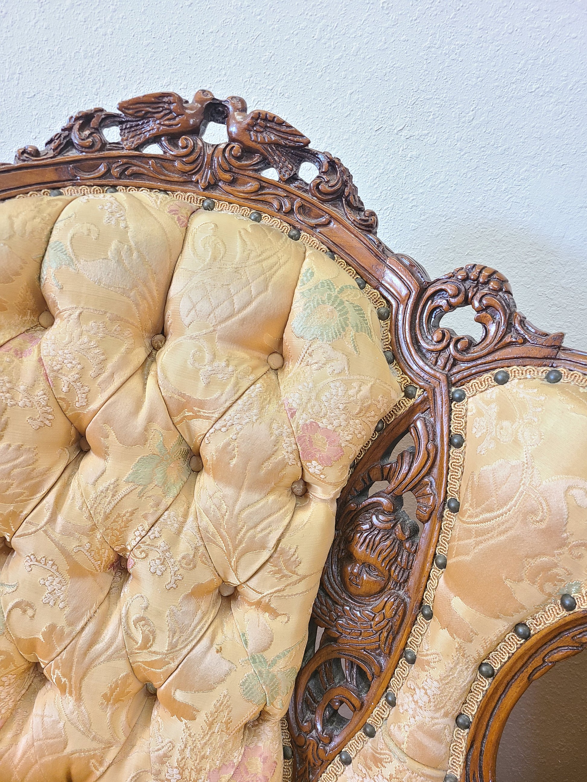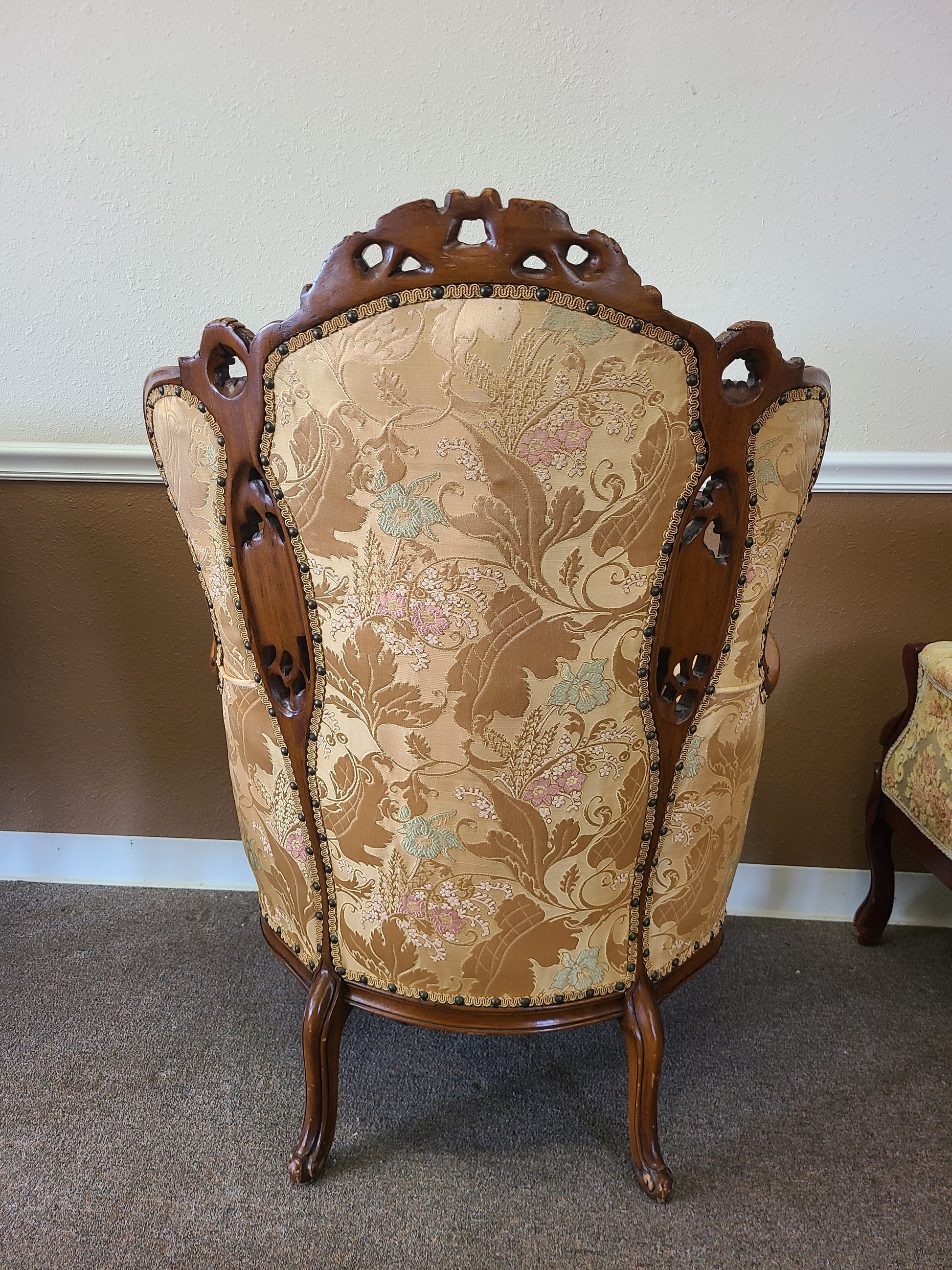 This is not a reproduction chair it is a gorgeous well kept antique chair with exquisite hand carved detail. It will get a complete overhaul from painting to its upholstery.