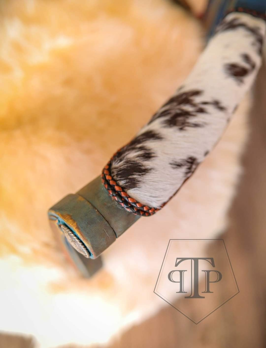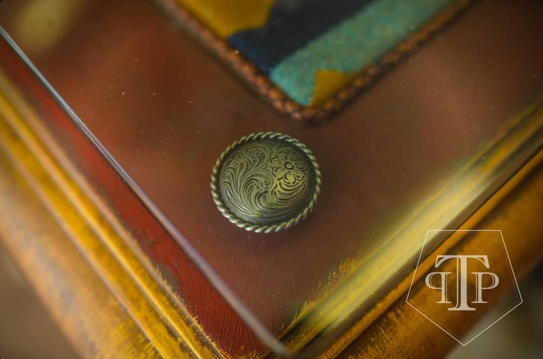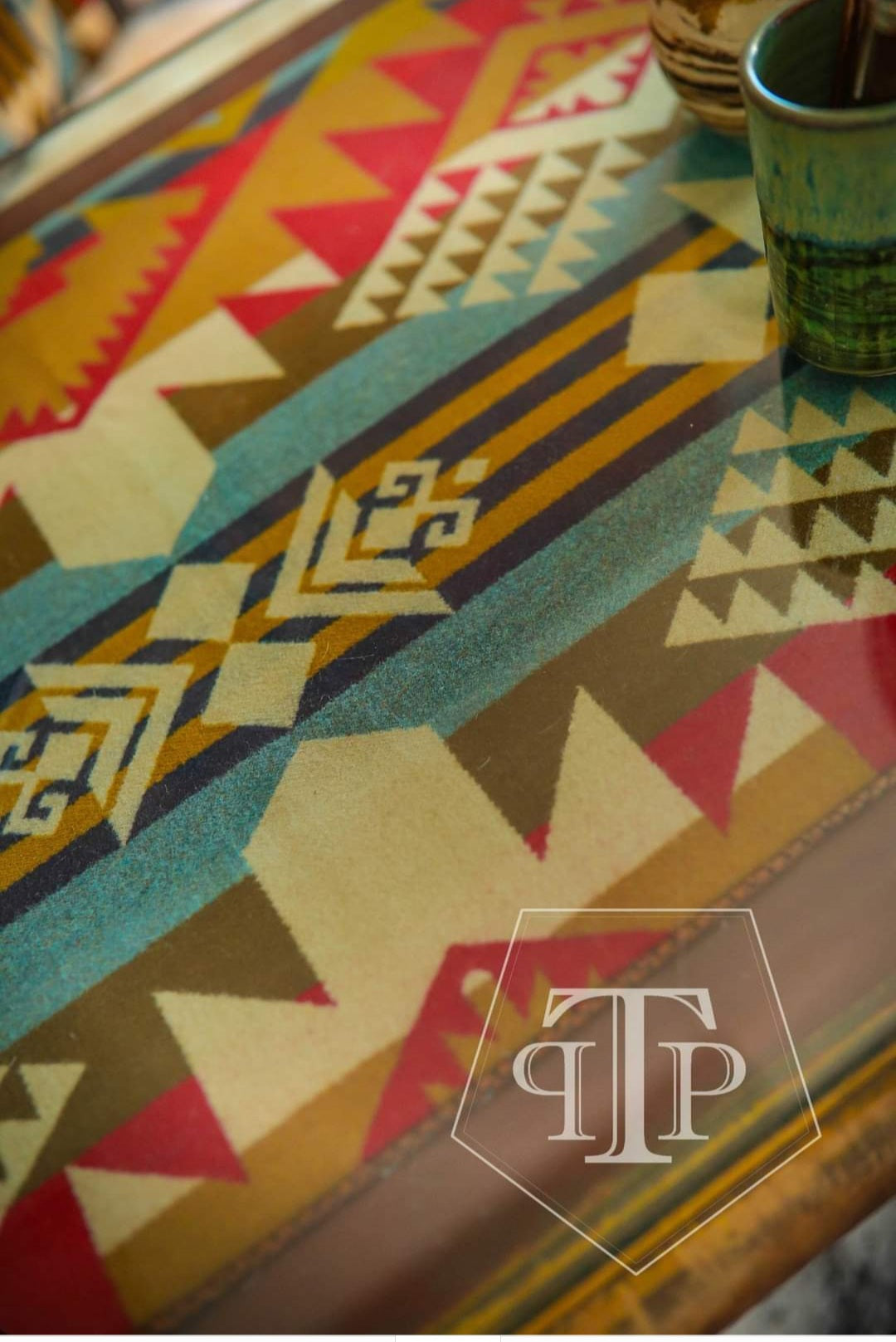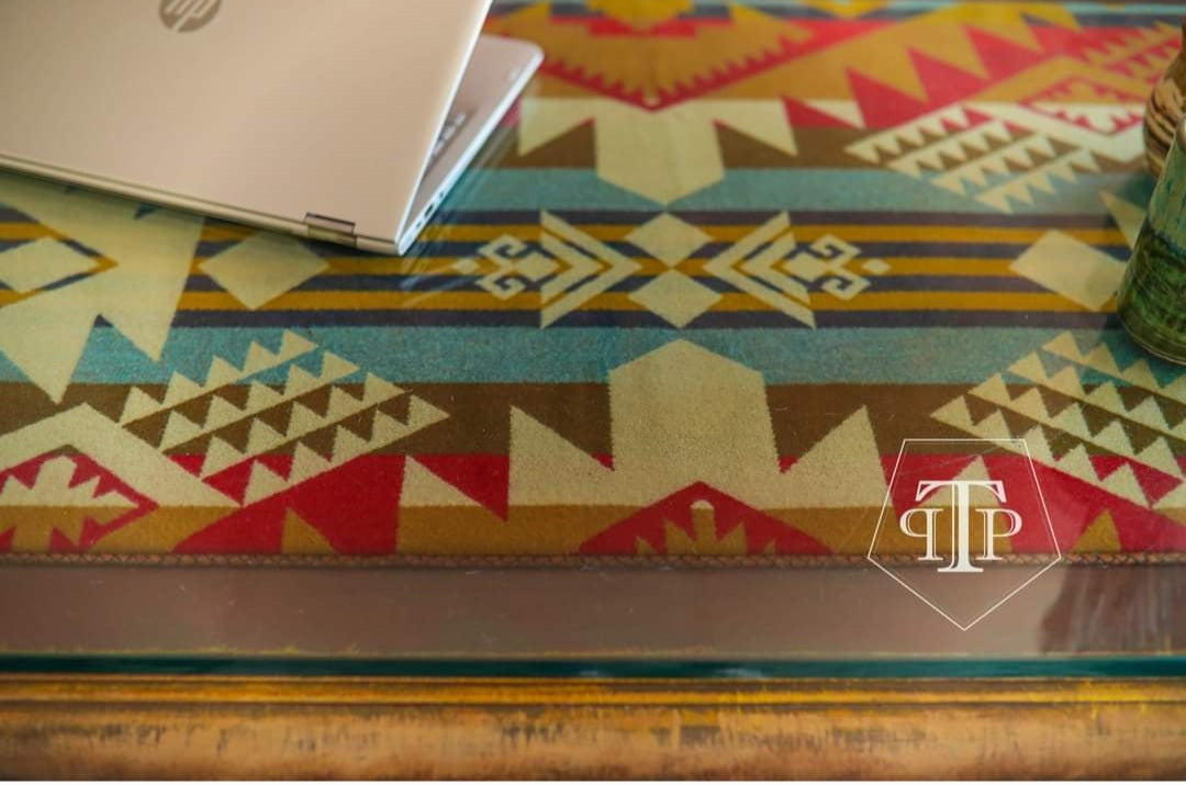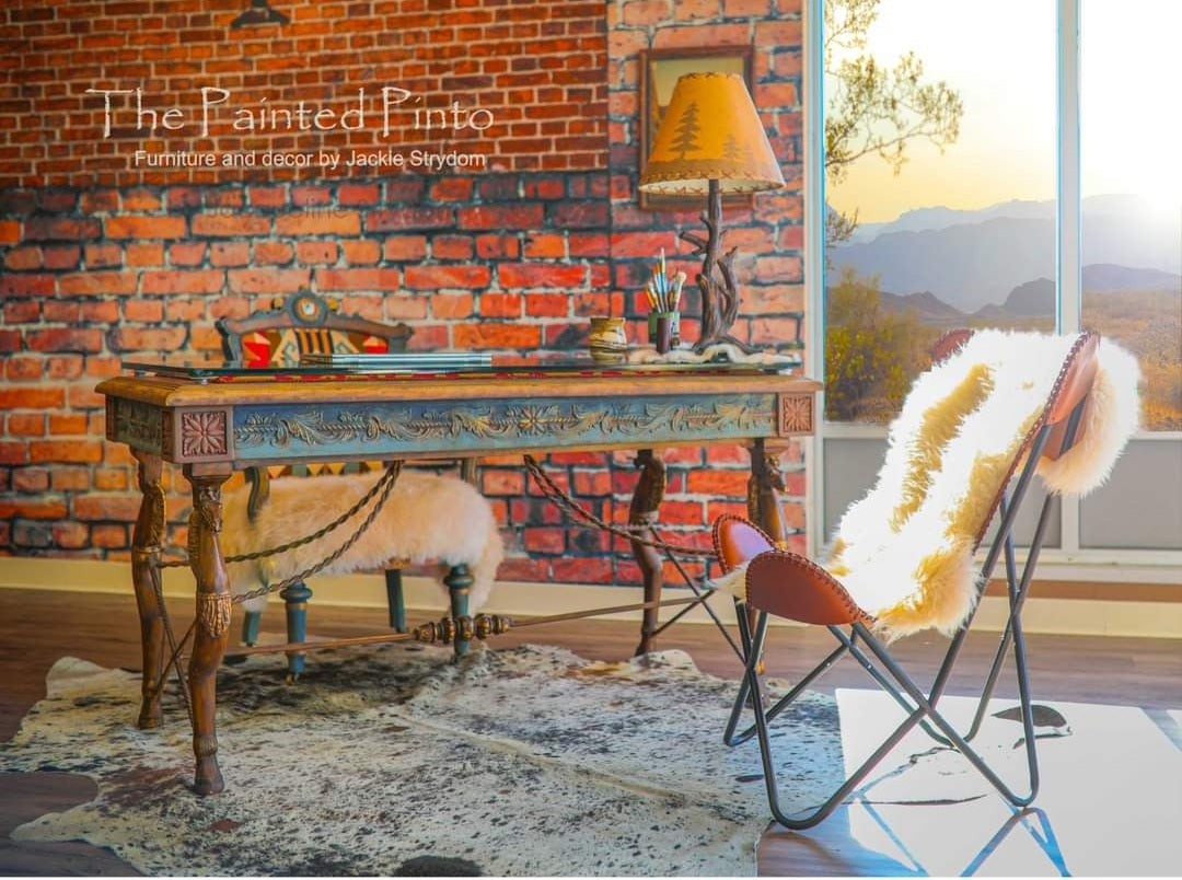 Handpainted desk with Pendleton blotter along with braided leather trim and magnificent concho supports as risers for glass top. The foundation of this desk is four iron steeds. The vintage office chair has been completely reconditioned and adorned with Pendleton, sheepskin and a very uniquely patterned cowhide back.