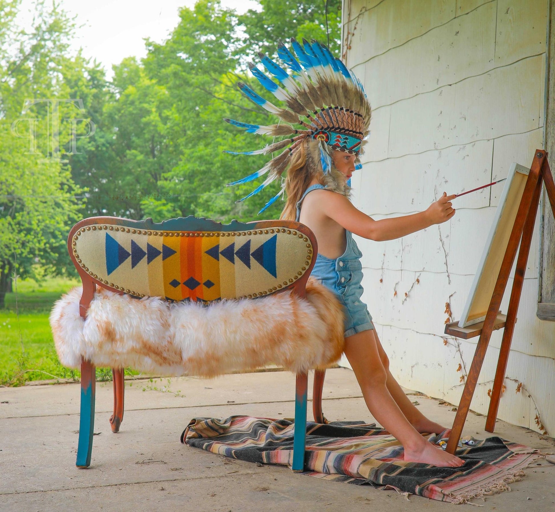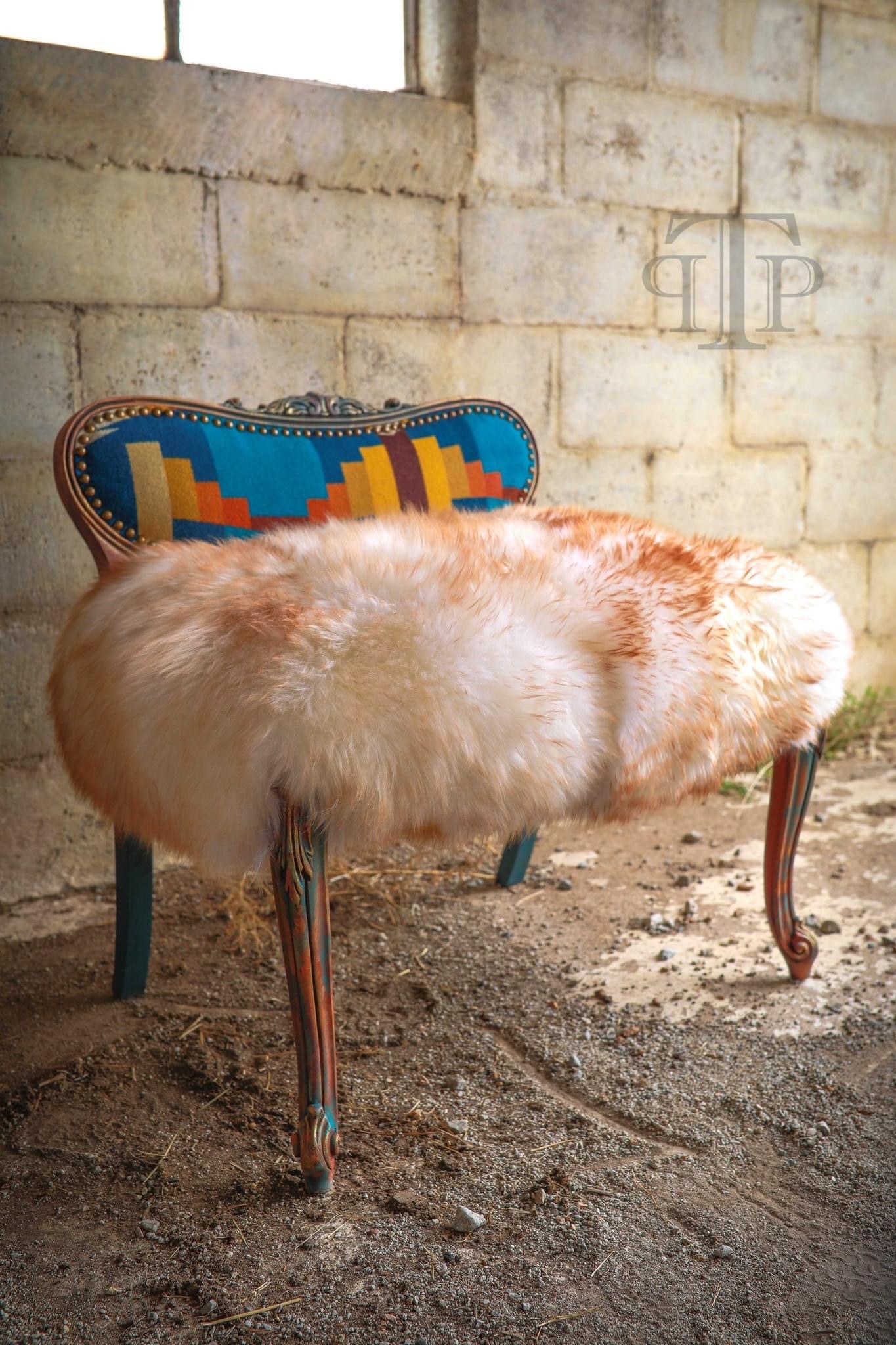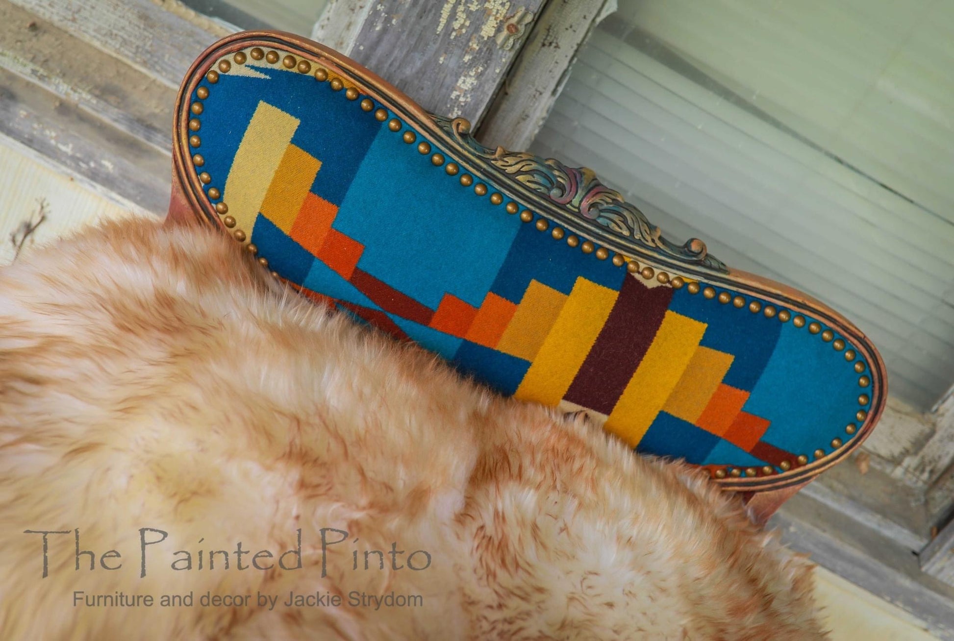Her gorgeous legs are all the colors in treasured gemstones and she is dressed with an soft and subtle honey and cream Iceland sheepskin. The very vibrant a Pendleton fabric makes all her assets pop with color.