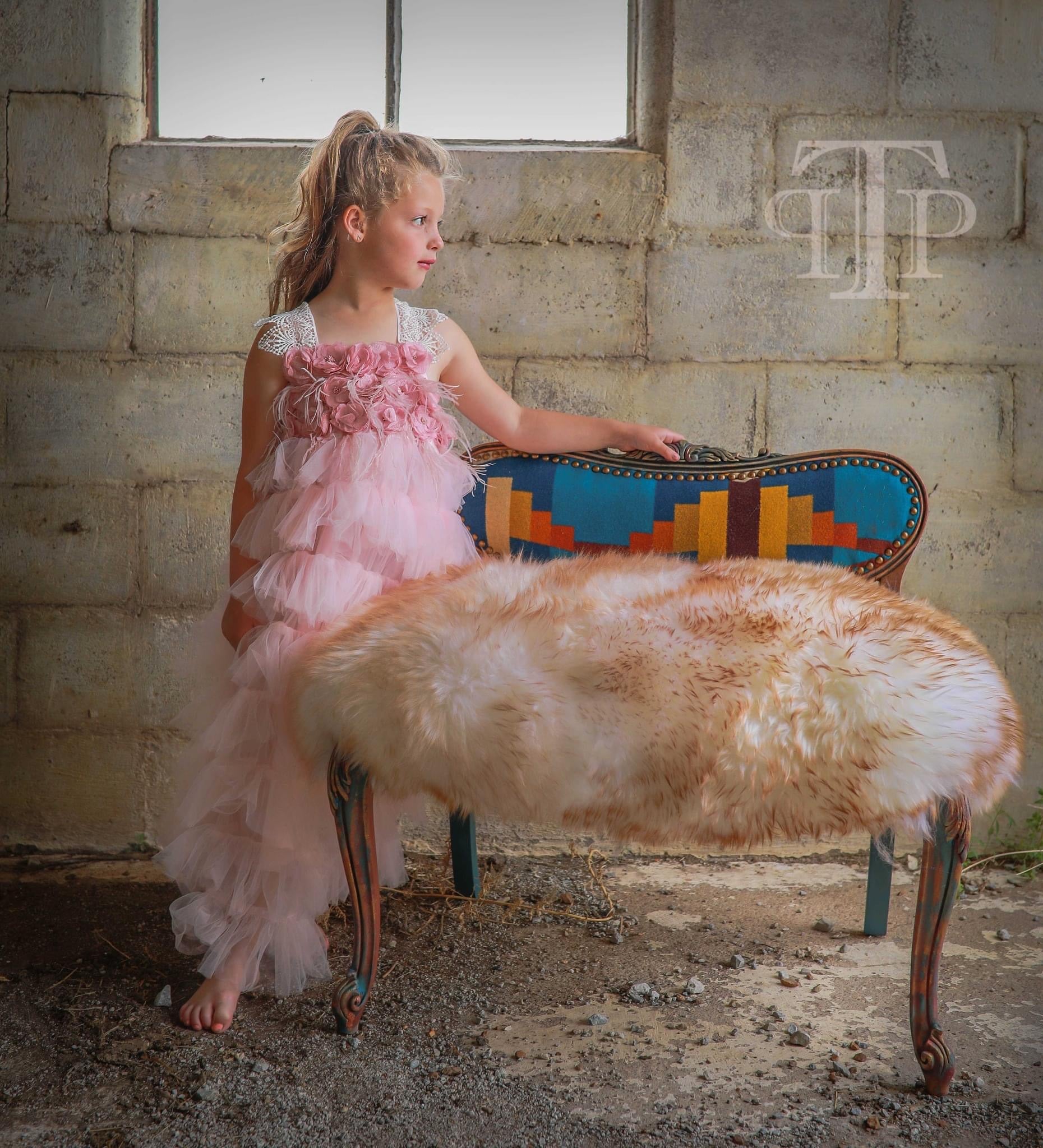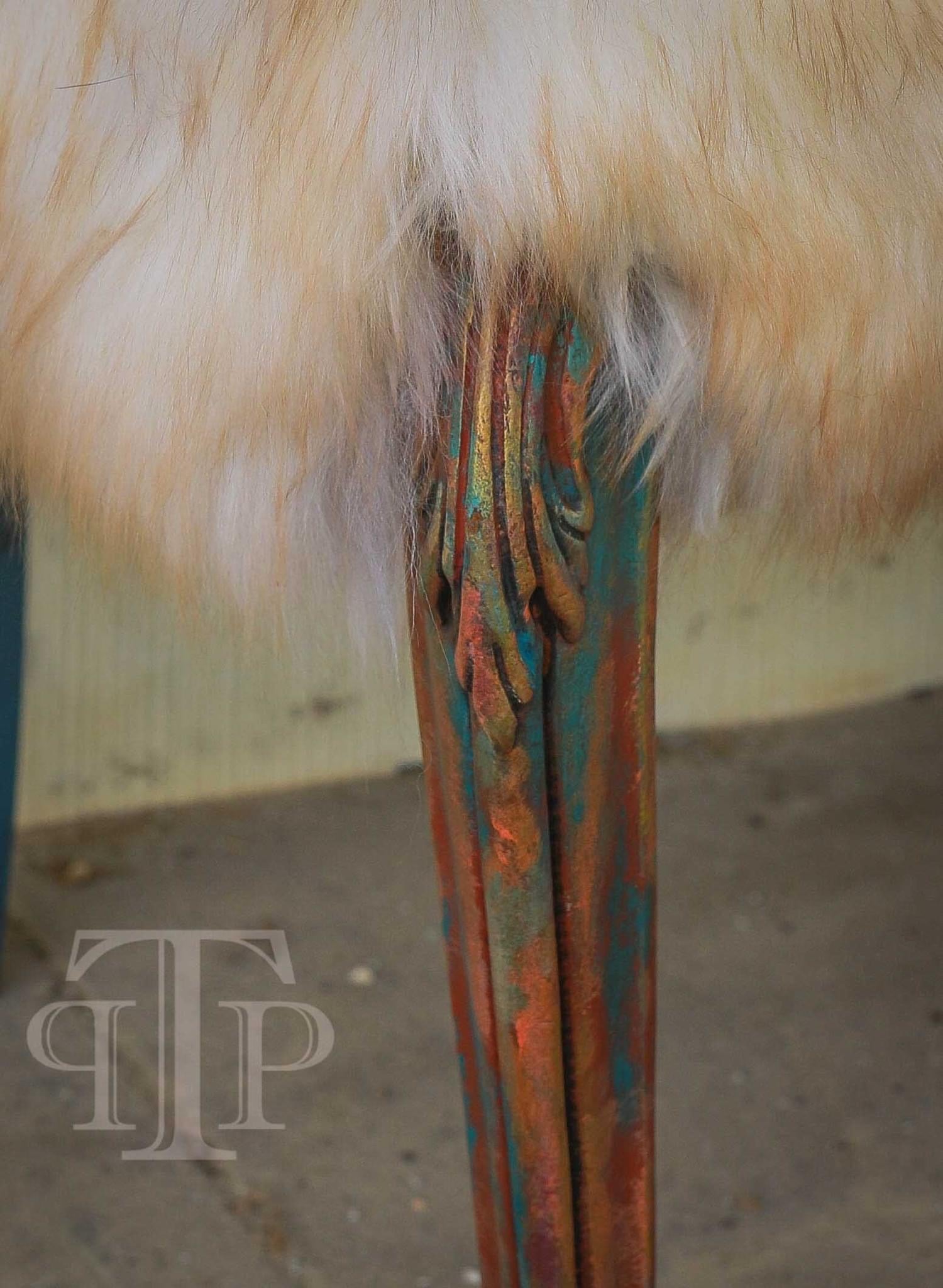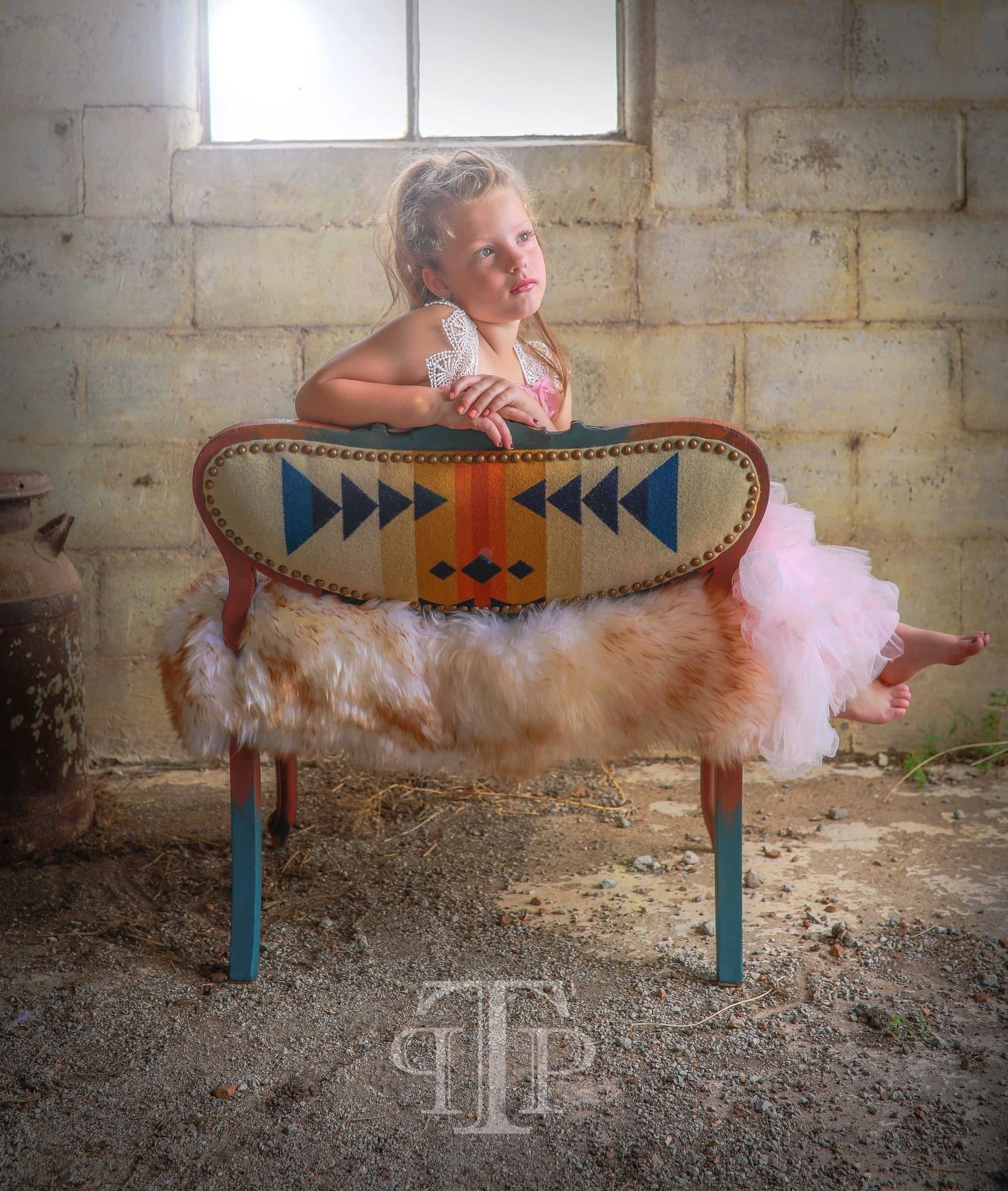 Her gorgeous legs are all the colors in treasured gemstones and she is dressed with an soft and subtle honey and cream Iceland sheepskin. The very vibrant a Pendleton fabric makes all her assets pop with color.