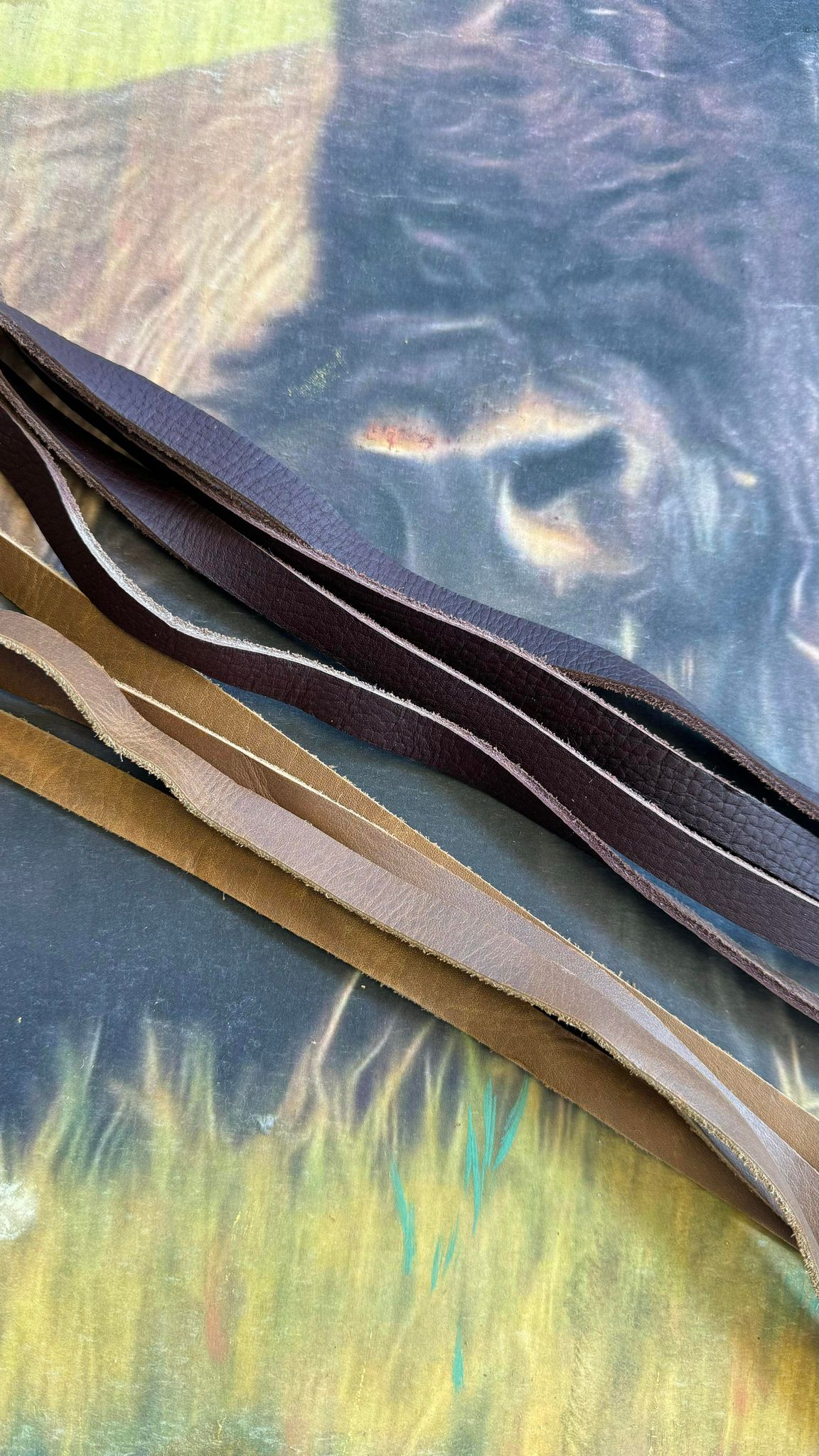 Premium leather strips have been cut from a special leather produced by Hermann Oak. They are veg tanned and dyed through. They look and feel as it they already have a finish, even a slight grain texture, but they still accept water, Width is 3/4 and Length is 72" approximately.