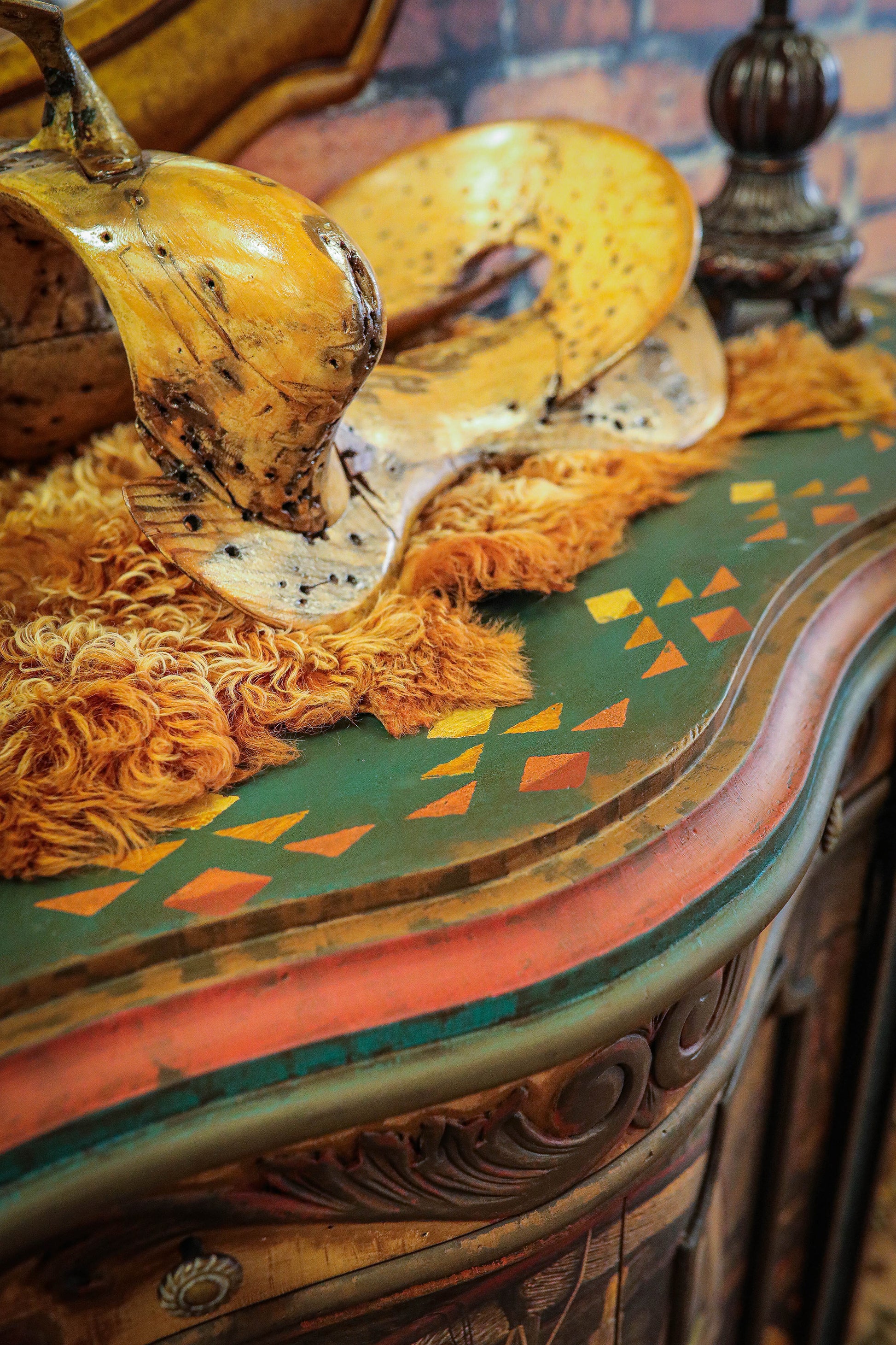 Long Journey is an incredible piece that showcases one of my very favorite deco papers yet. It has been completely hand painted and the top has a simple but whimsical tribal pattern to add to it's Western decor design. The recessed supports were upholstered with a beautiful blue tooled suede for that extra touch,
