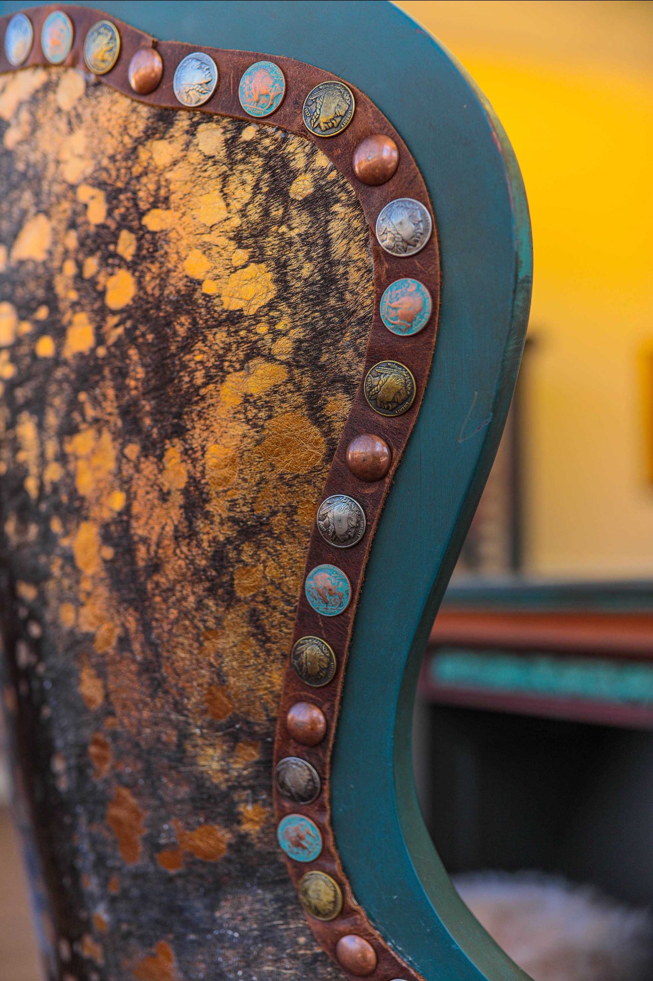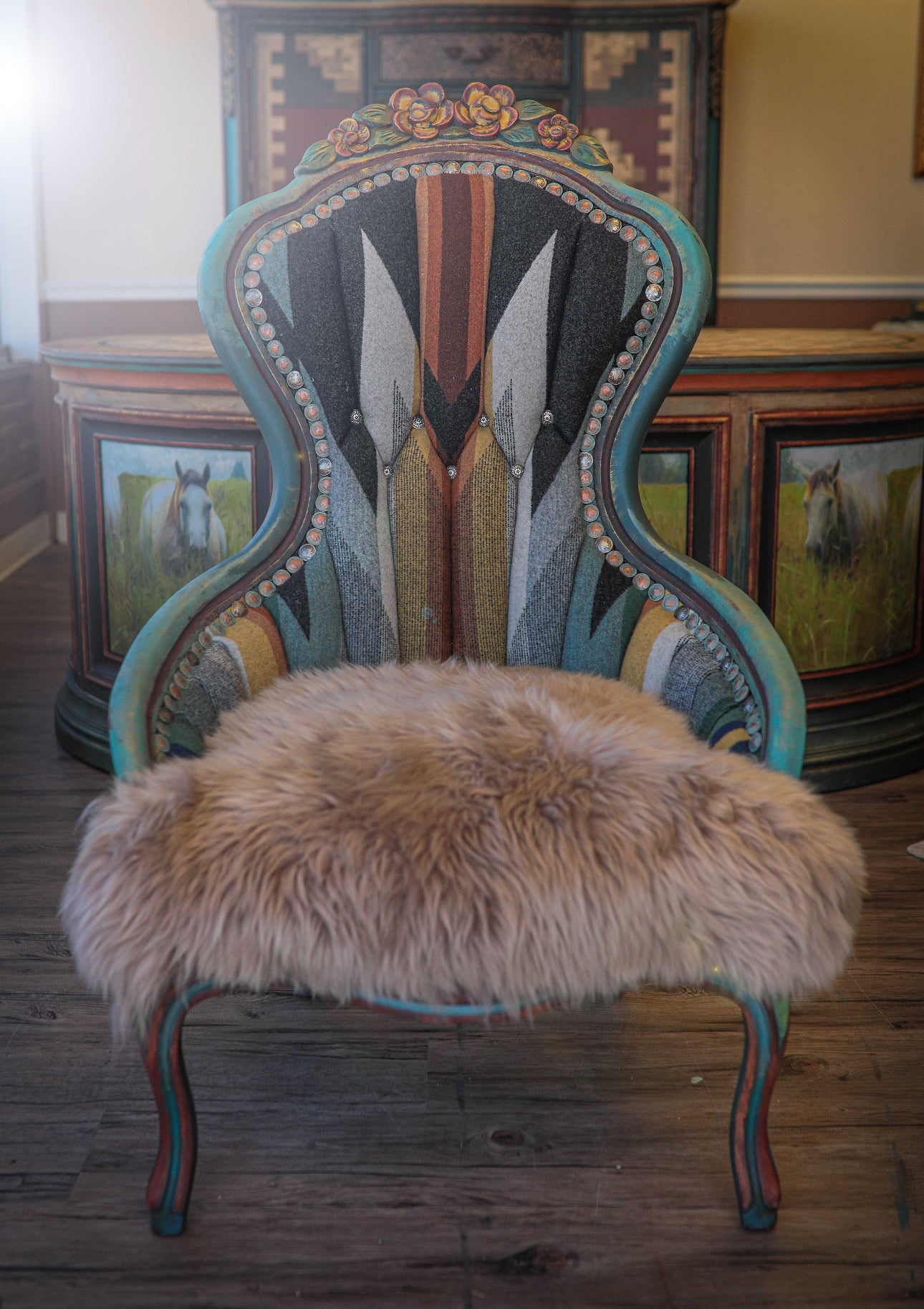 Four Winds - this vibrant Victorian reproduction chair has creatively hand painted it reds to showcase the bold Pendleton fabric. It has a striking black and cream speckled hide with copper tacking for that perfect detail. This large one of a kind statement piece is perfect for any room, office, master bedroom, closet or sitting room.