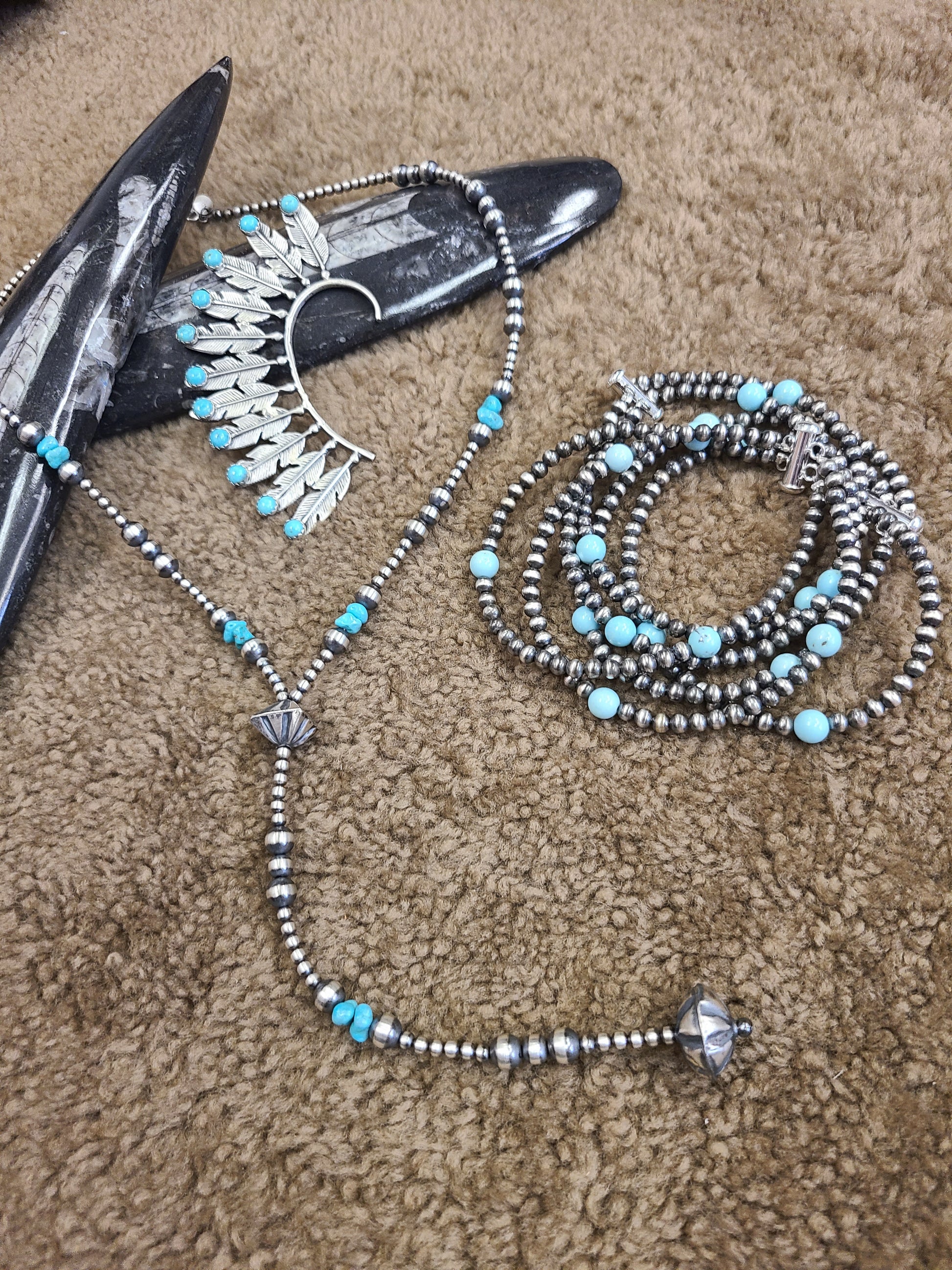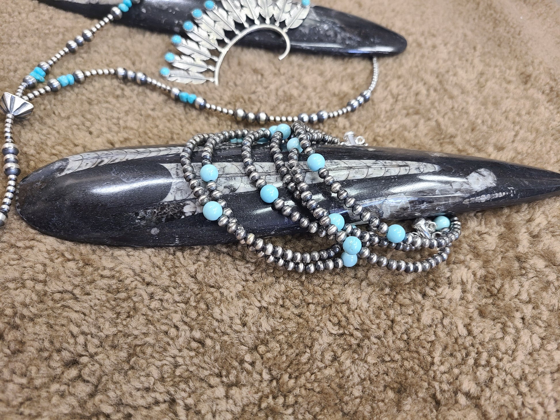 Gorgeous Navajo pearl an turquoise bracelets have been created by Native American artist of sterling silver and genuine turquoise, Easy slide closure for clasp, 4mm SS pearls and 6mm turquoise.