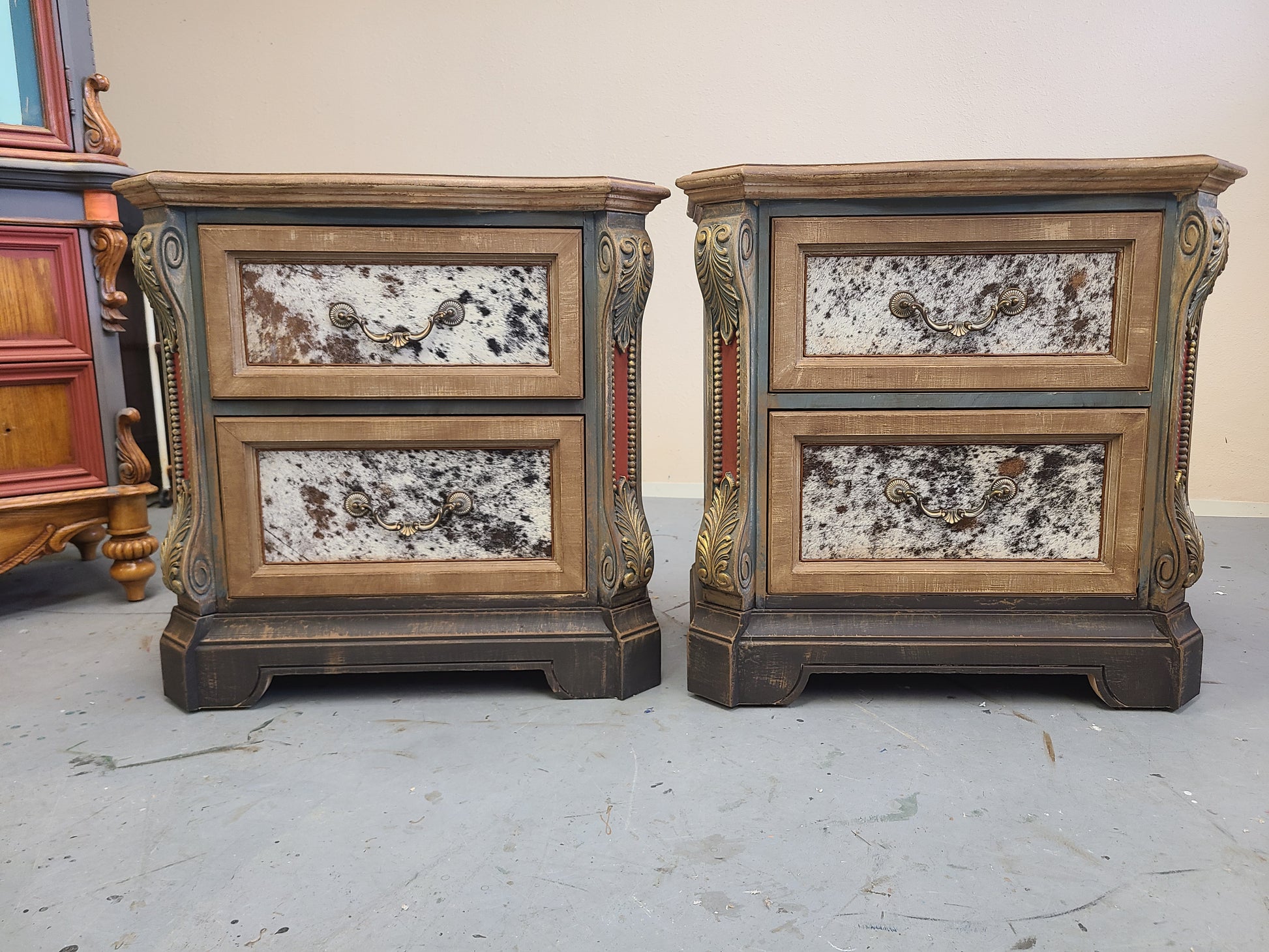 Handpainted nightstand set adorned with custom leather.
