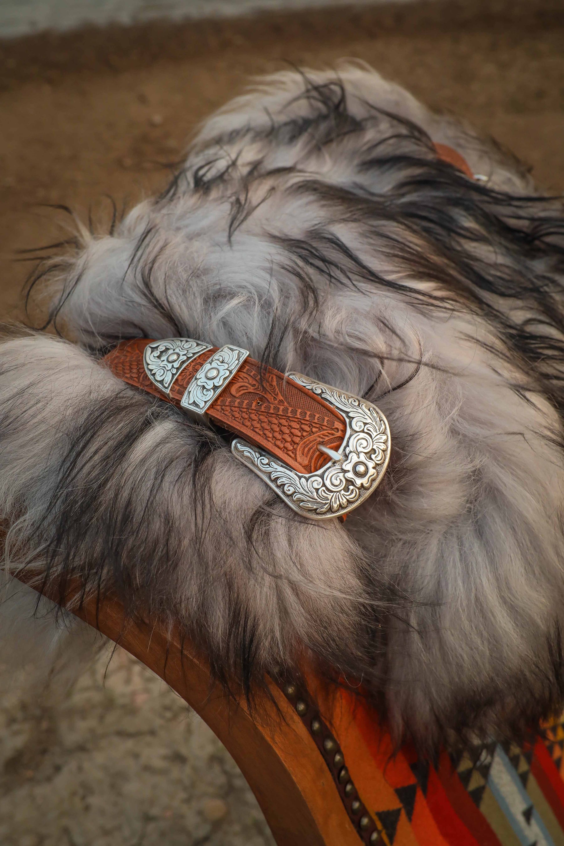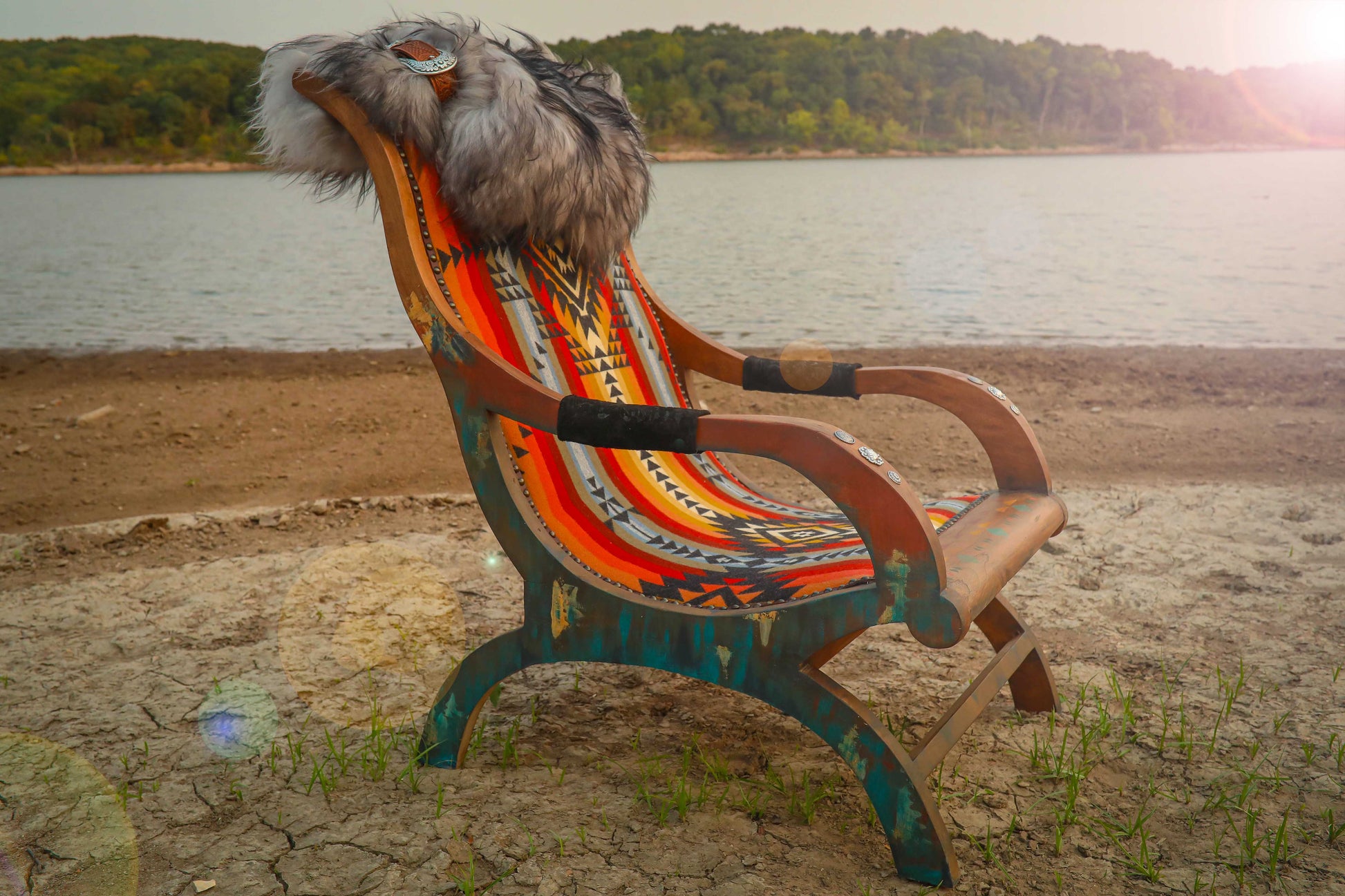Santa Fe Trail - Eclectic southwestern BOHO lounge chair that has been upholstered with Pendleton Fabric, Mongolian sheepskin, tooled leather and tacked detail, it is a very vibrant rugged but stylish design. This one of a kind hand painted and upholtered piece is in a very southwestern theme with an extremely unique quality furniture with astonishing character!