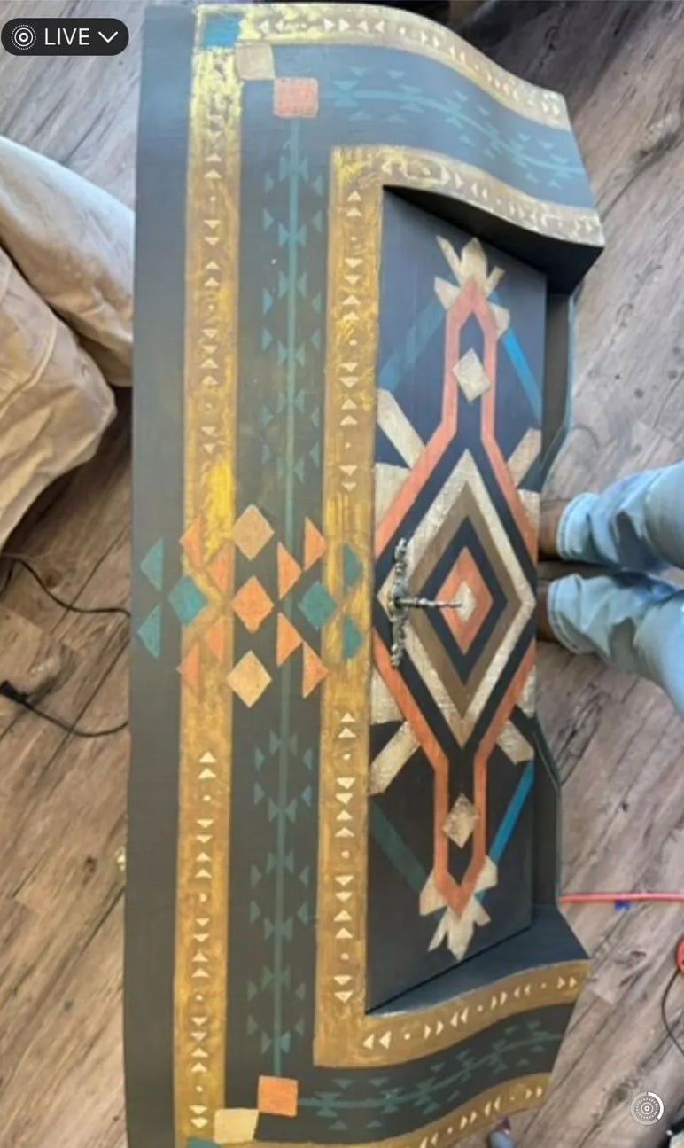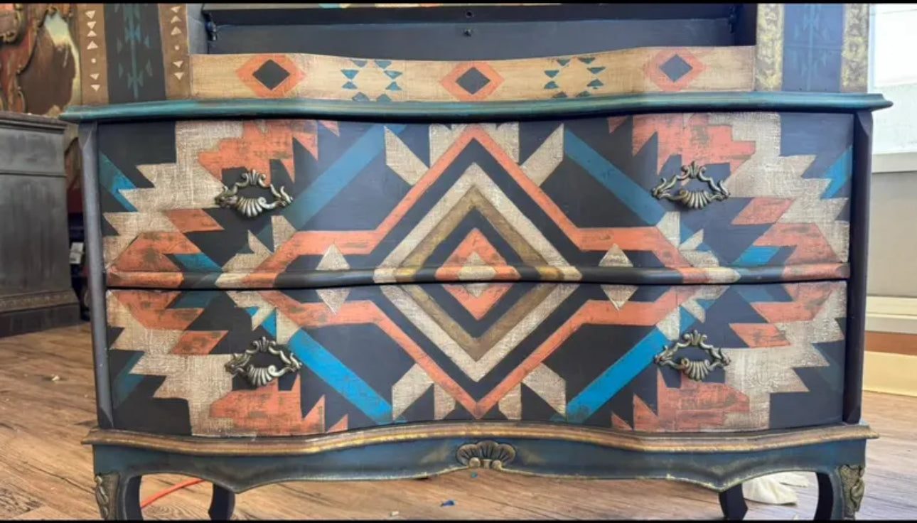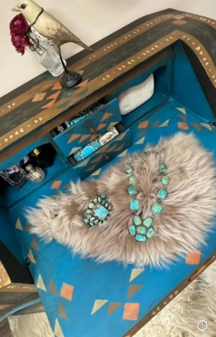 All of my pieces are hand painted one of a kind. This vintage piece has two small drawers that have been customized to hold your small jewelry. It also has two small side cabinets perfect for your perfumes. It also has a nice drop down top and two full drawers for storage.