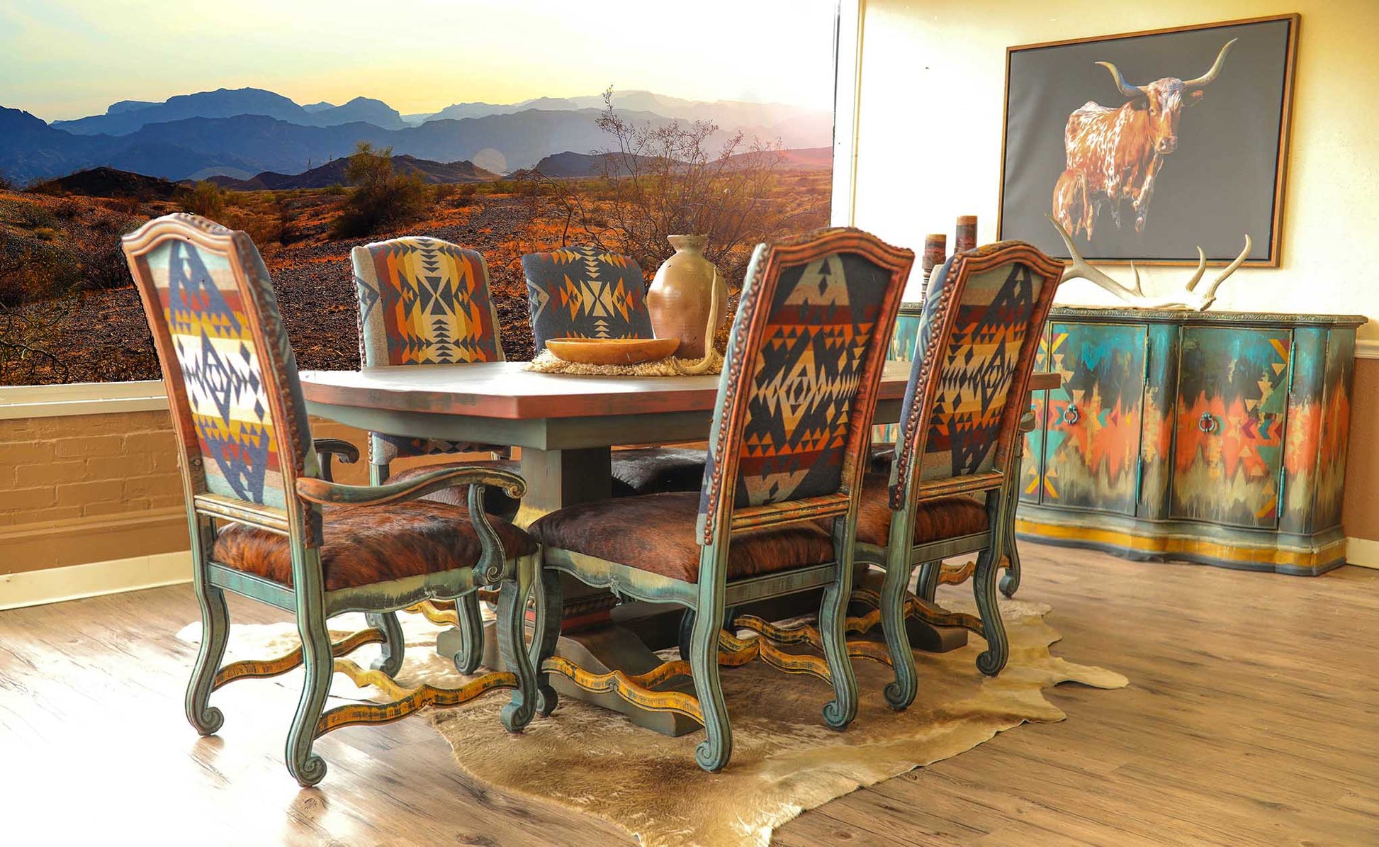 This beautiful one of a kind heirloom dining room set has all the halmarks of past dinners while proudly displaying all the vibrant and luxurious upholsetery of genuine Pendletion Woolen Mill fabrics. Seating for six leaves no one out of the holiday celebration.