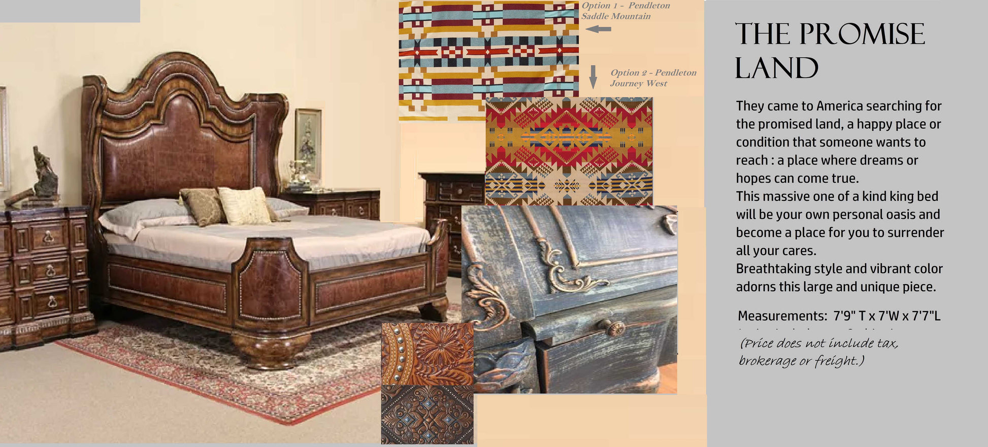 They came to America searching for the promised land, a happy place where hopes and dreams would come true. This has been the song of the faithful since the beginning of time. This massive one-of-a-kind original custom handmade king size bed will be your personal oasis to surround you and a place for you to surrender all your cares.