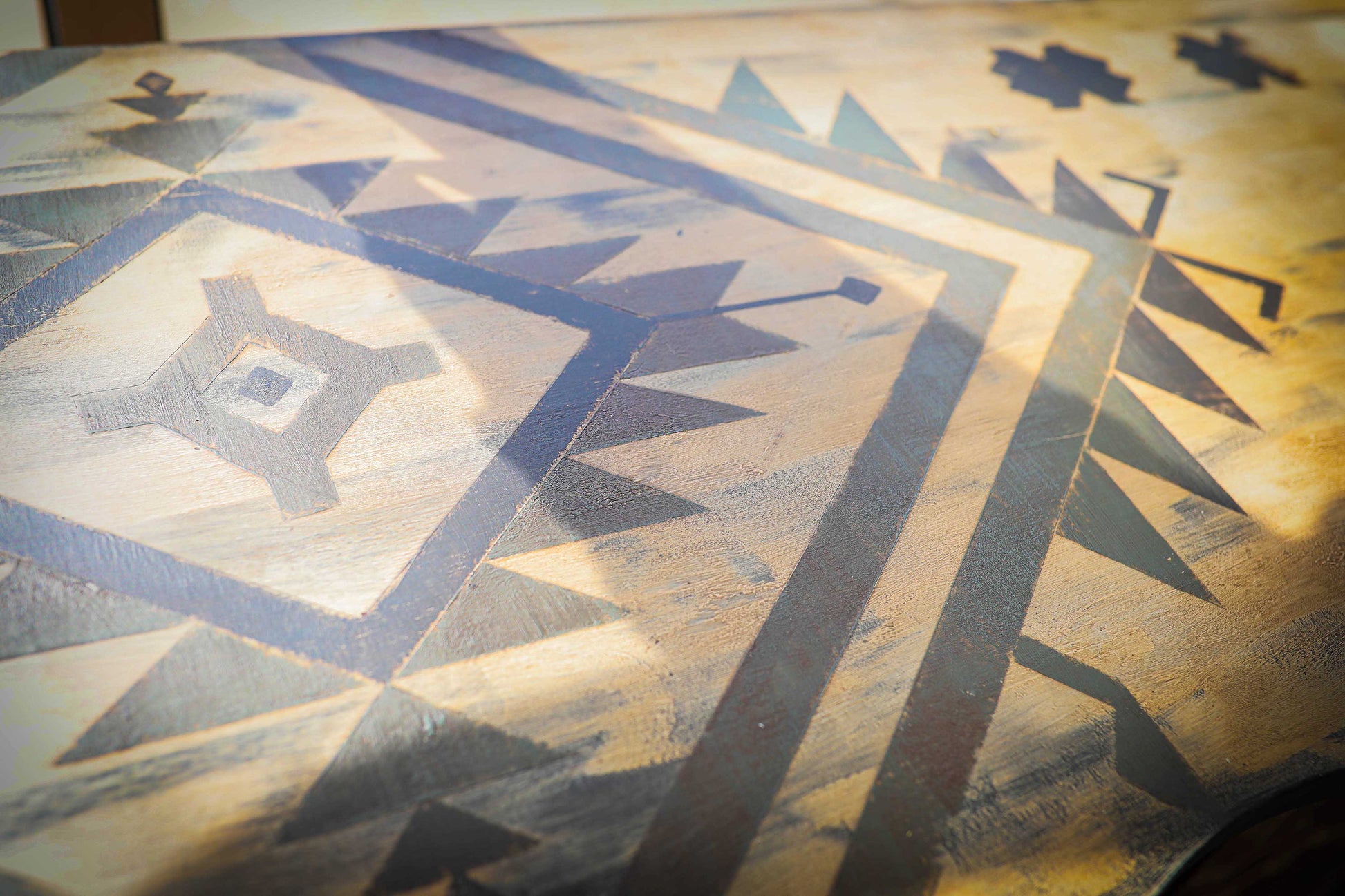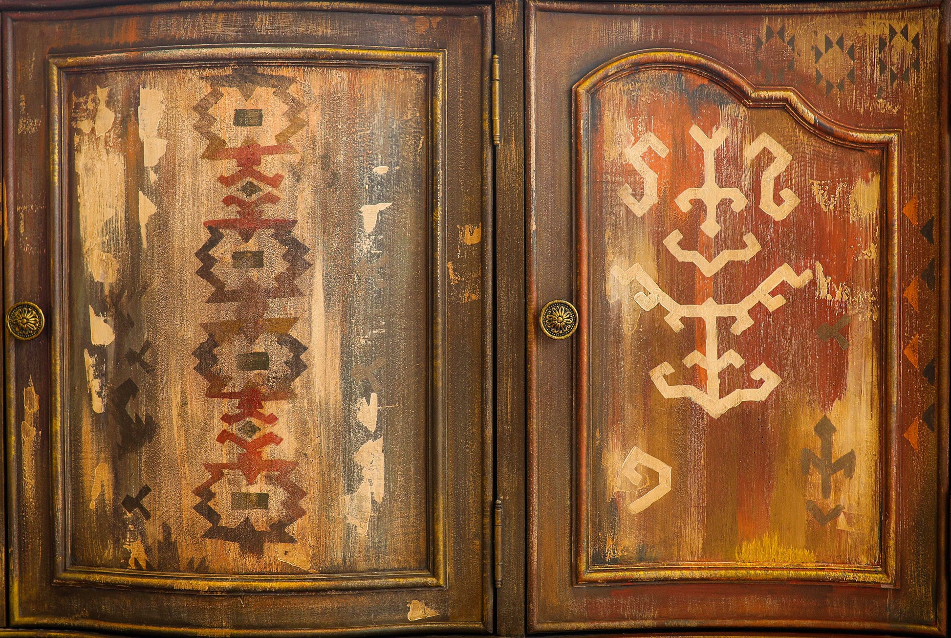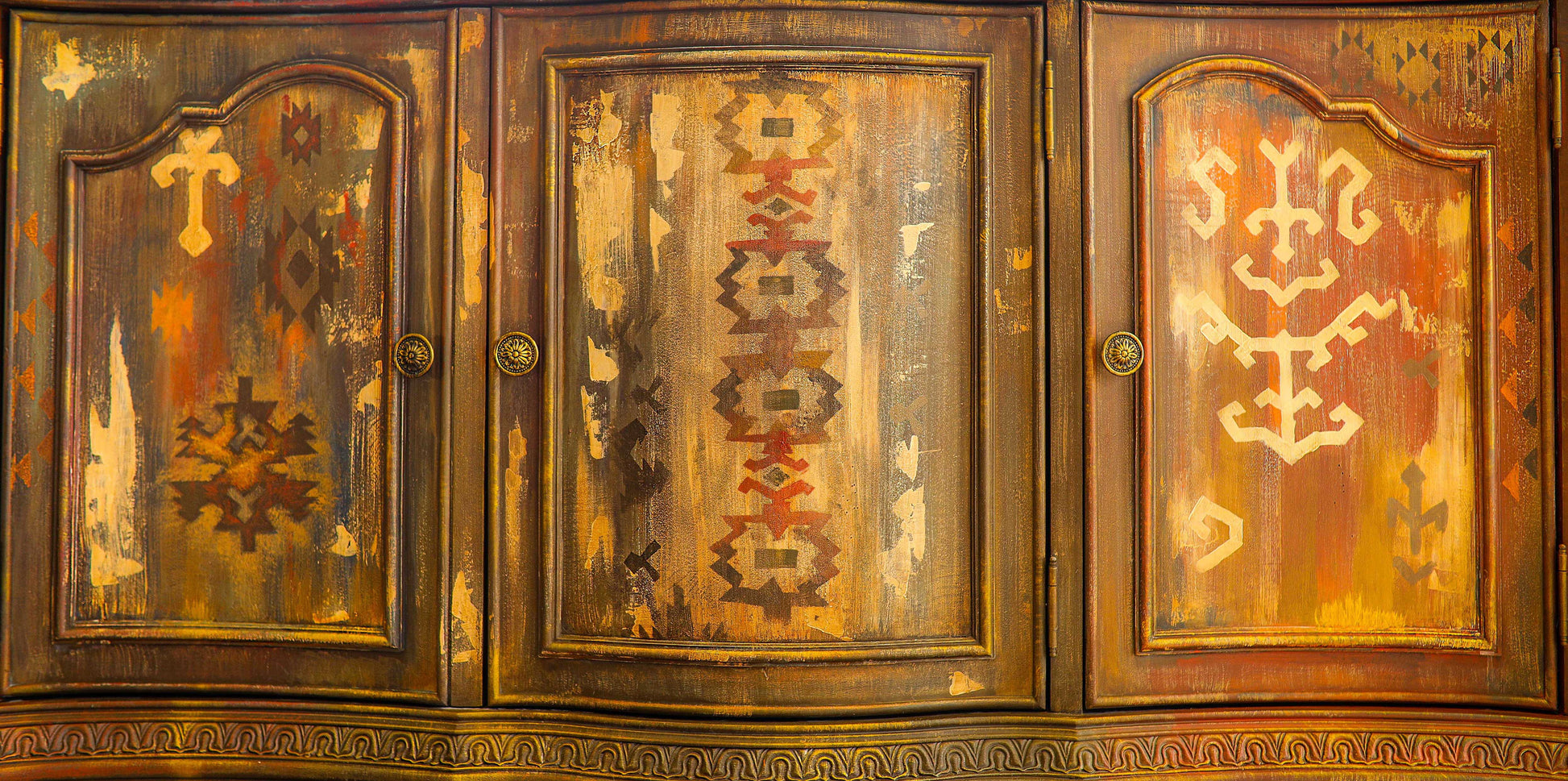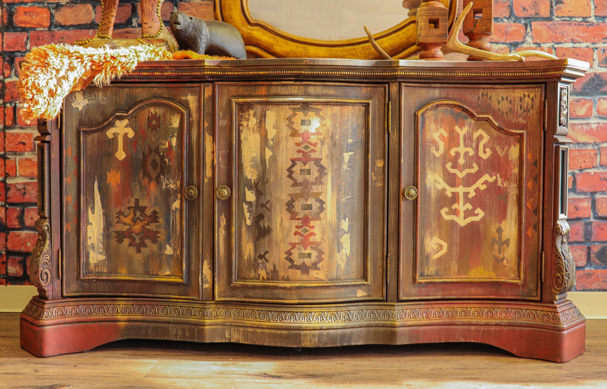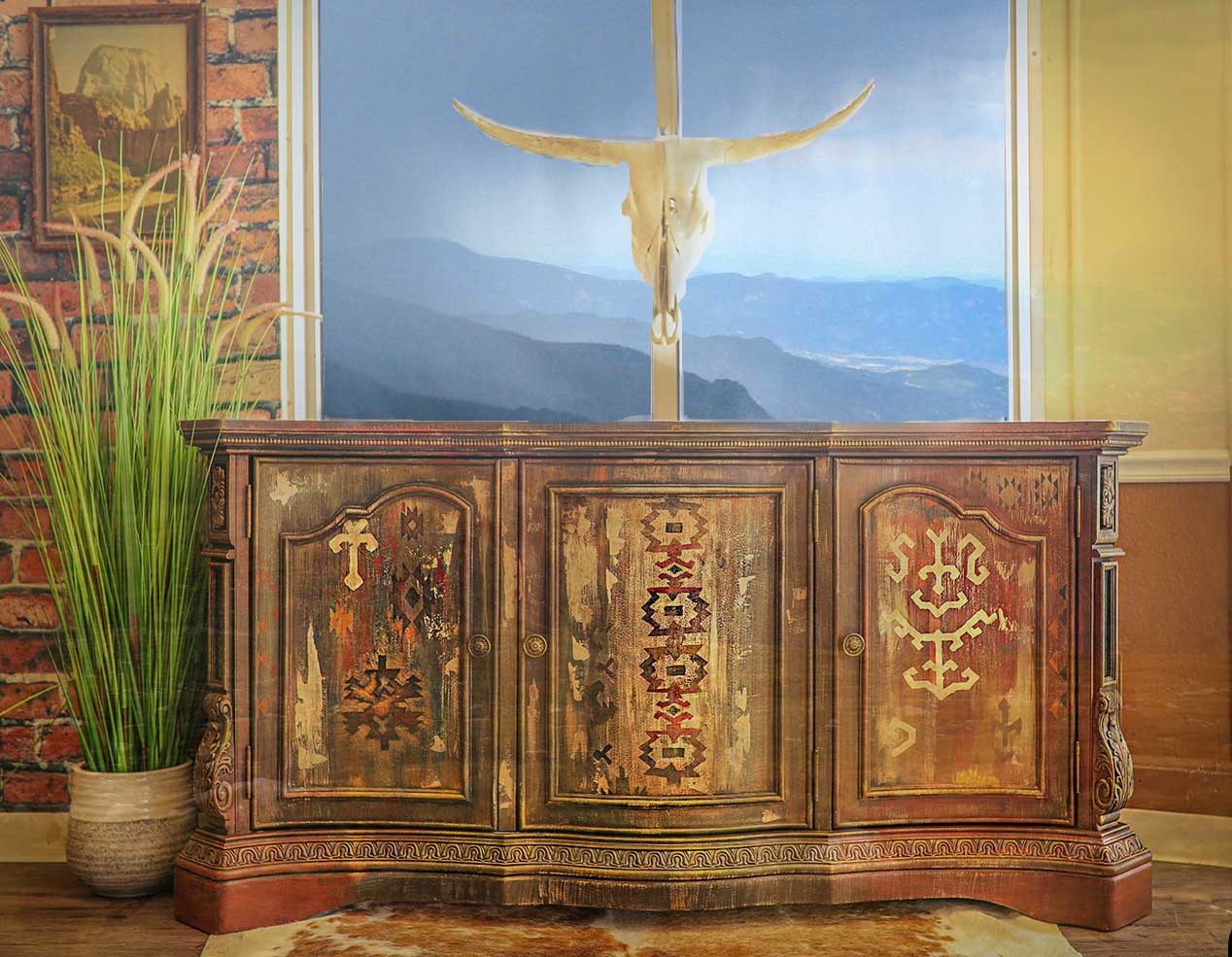 War Paint -This stunning console buffet is a one of a kind abstract furniture art piece. Nothing short of an heirloom that boast Western culture and flaunts it's vibrant color and tribal design will be a statement piece for your mountain retreat, ranch, villa or southwestern oasis.